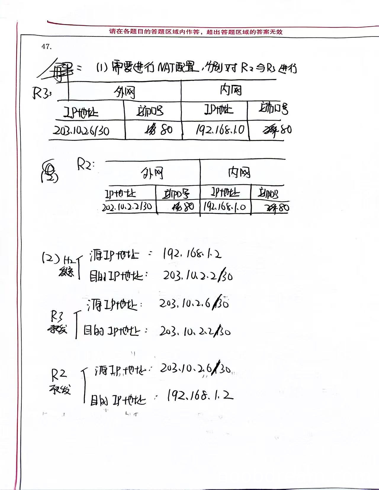 - R3转发后的源IP(203.10.2.6)和目的IP(203.10.2.2)正确,但IP地址多写了"/30",判断为误写不扣分。