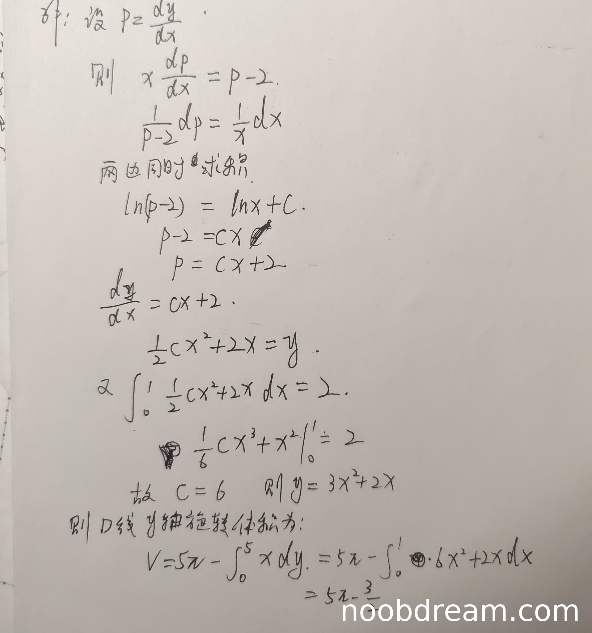 学生正确进行了变量代换(设p=y'),将方程化为可分离变量形式,并正确积分得到y'=Cx+2,再积分得到y=½Cx²+2x。此处步骤完整且正确,得4分。
