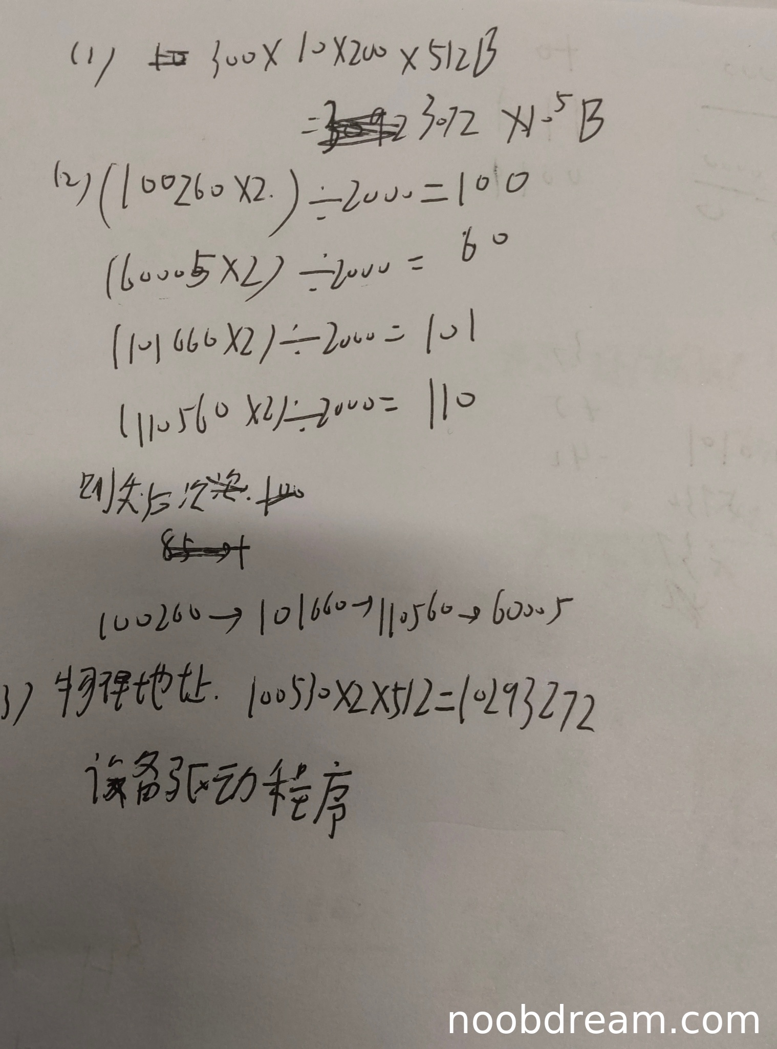 第一问:学生计算100510×2×512=10293272,这是计算簇的字节偏移量,而非题目要求的物理地址(柱面号、磁道号、扇区号)。物理地址计算错误。扣1分。