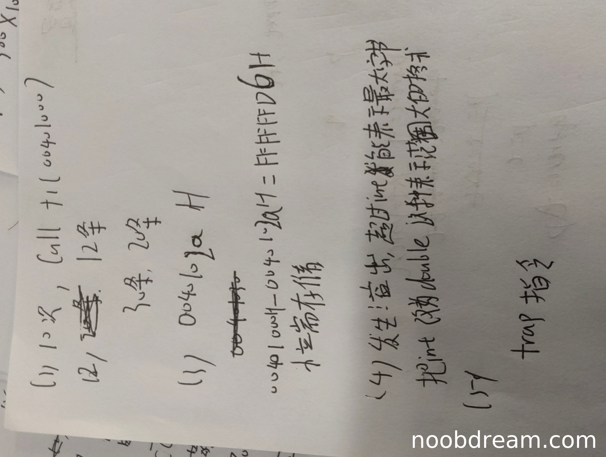 学生第一问未回答溢出条件;第二问回答“trap指令”基本正确,对应溢出自陷指令。第一问逻辑错误扣2分,第二问正确得2分,本小题得2分。