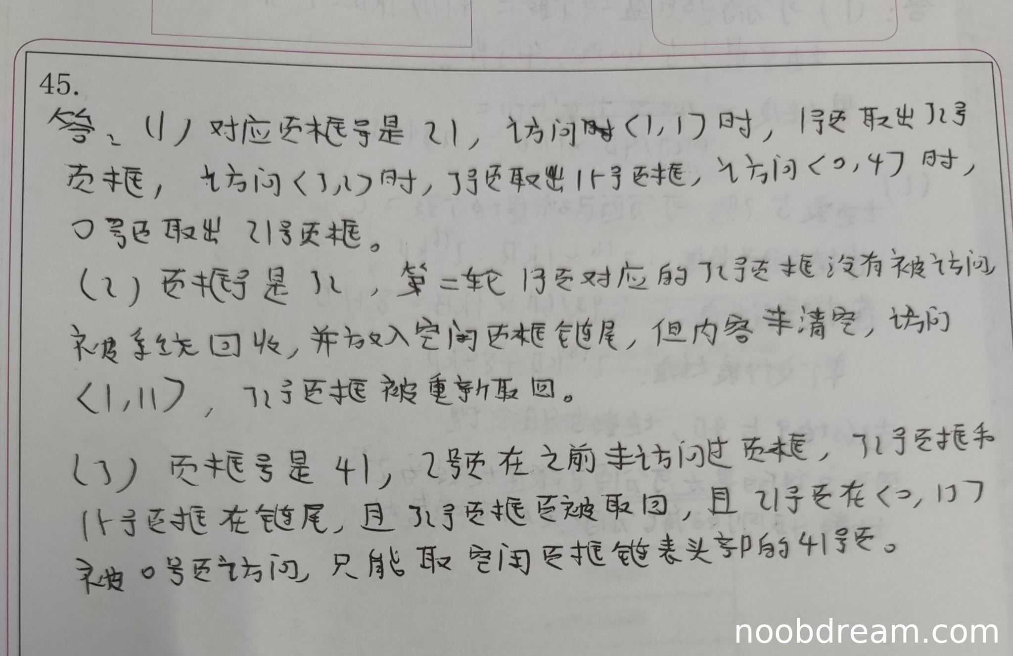 学生答案中写的是71,但标准答案是32。根据题目描述,空闲页框链表初始为32、15、21、41。访问<1,1>时应该取链表头部的32号页框分配给页1,而不是71。学生此处存在逻辑错误,扣1分。但学生理解了第二轮扫描回收和重新取回的机制,得1分。最终得1分。