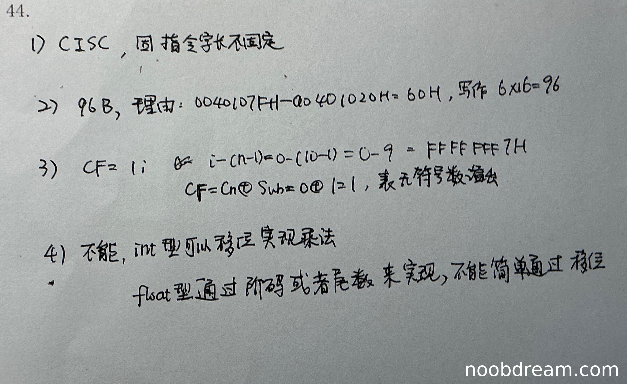 学生回答“CF = 1;因为i - (n - 1)=0 - (10 - 1)=0 - 9 = FFFFFFF7H,CF = Cn⊕Sub = 0⊕1 = 1,表无符号数溢出”。其中,CF=1正确,但计算过程有误:f1(0)时n=0,n-1=0xFFFFFFFF,不是9;学生错误地使用了n=10。但CF的计算公式“CF = Cn⊕Sub = 0⊕1 = 1”正确,且最终结果正确。由于核心逻辑(CF=1)正确,且计算过程部分正确,但存在逻辑错误(n值错误),扣1分。得2分。