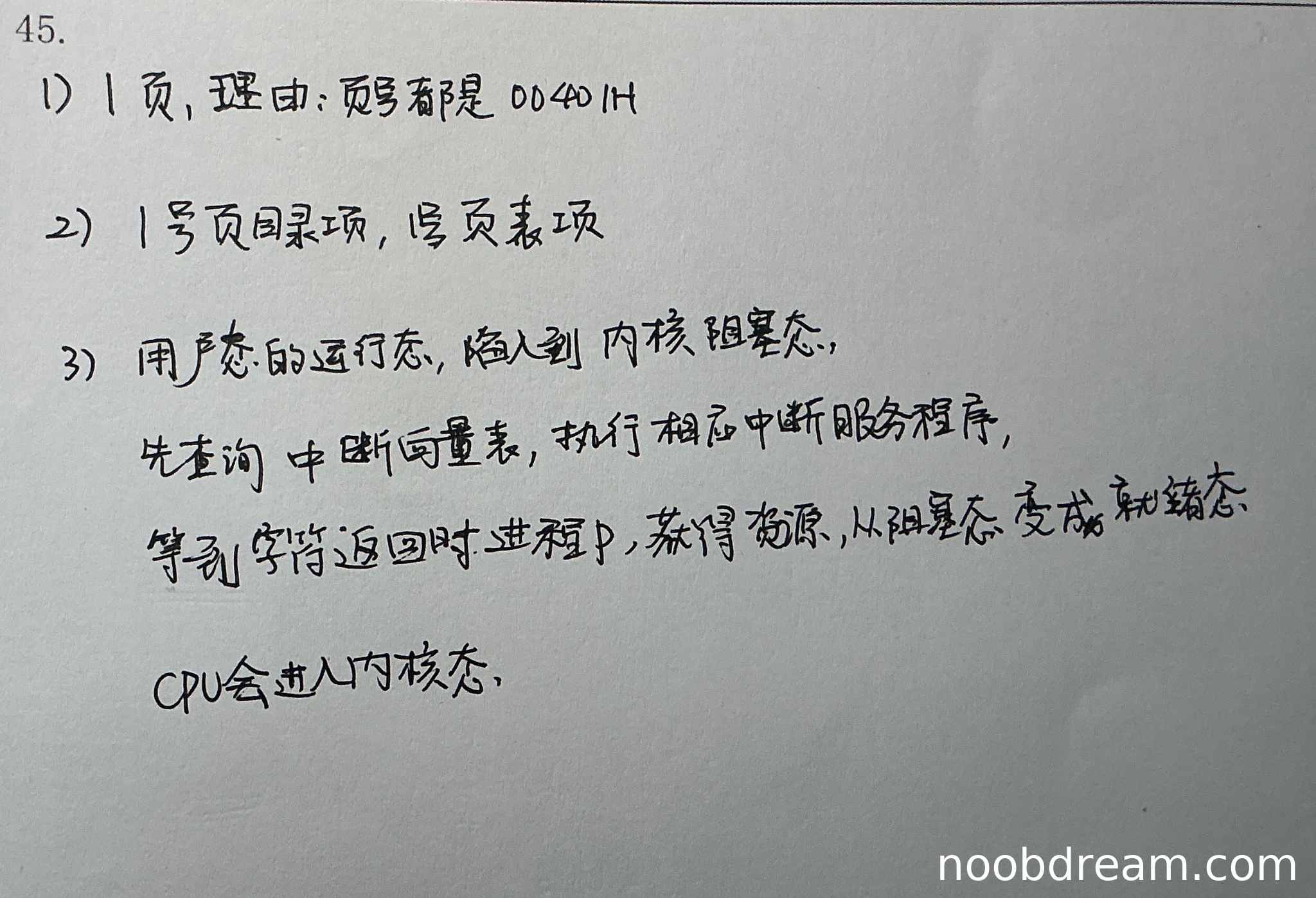 学生回答“1页”,理由为“页号都是00401H”,这与标准答案中“所有指令的虚拟地址的高20位相同,因此在同一页”的逻辑一致。虽然学生给出的具体页号“00401H”与标准答案中的二进制分析方式不同,但思路正确,结论正确,因此得1分。