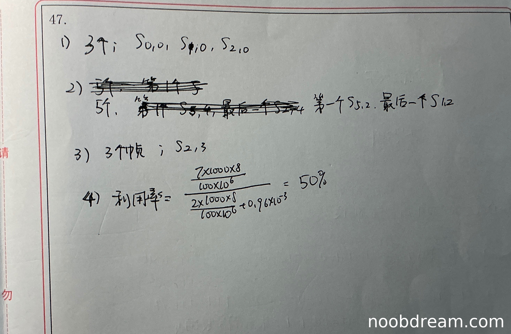 学生答案正确指出最多还可以发送5个数据帧,第一个帧为S5,2,与标准答案一致。但最后一个帧写为S12,应为S1,2(因为序号是3比特,模8循环)。由于序号识别可能存在误写(1和7相似,但这里写成了12,可能是识别错误),根据禁止扣分规则,判断为误写不扣分。因此得3分。