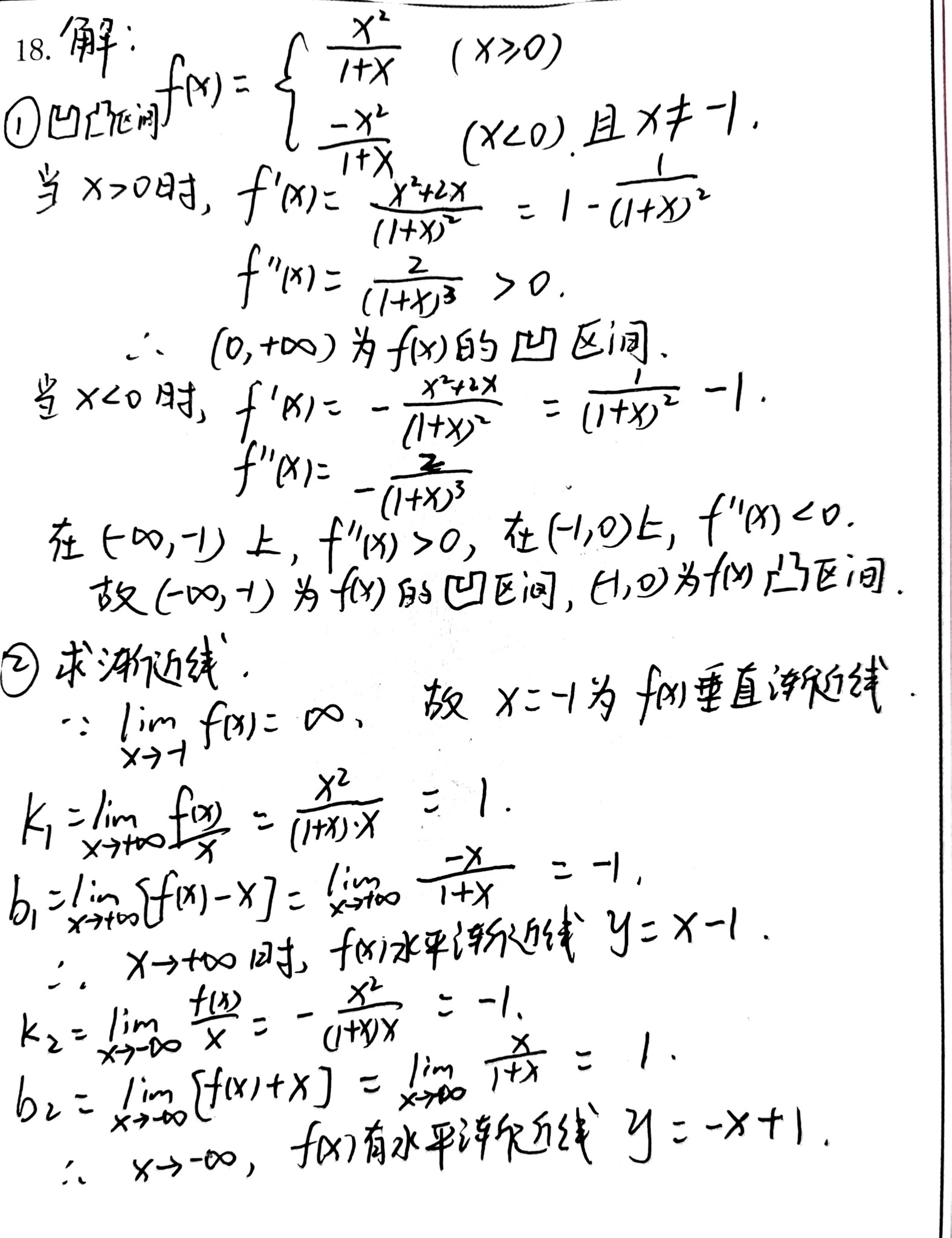 学生正确求出了垂直渐近线x=-1,并分别对x→+∞和x→-∞的情况求斜渐近线。计算过程正确,结果与标准答案一致:当x→+∞时斜渐近线为y=x-1,当x→-∞时斜渐近线为y=-x+1。该部分回答完整正确,得6分。