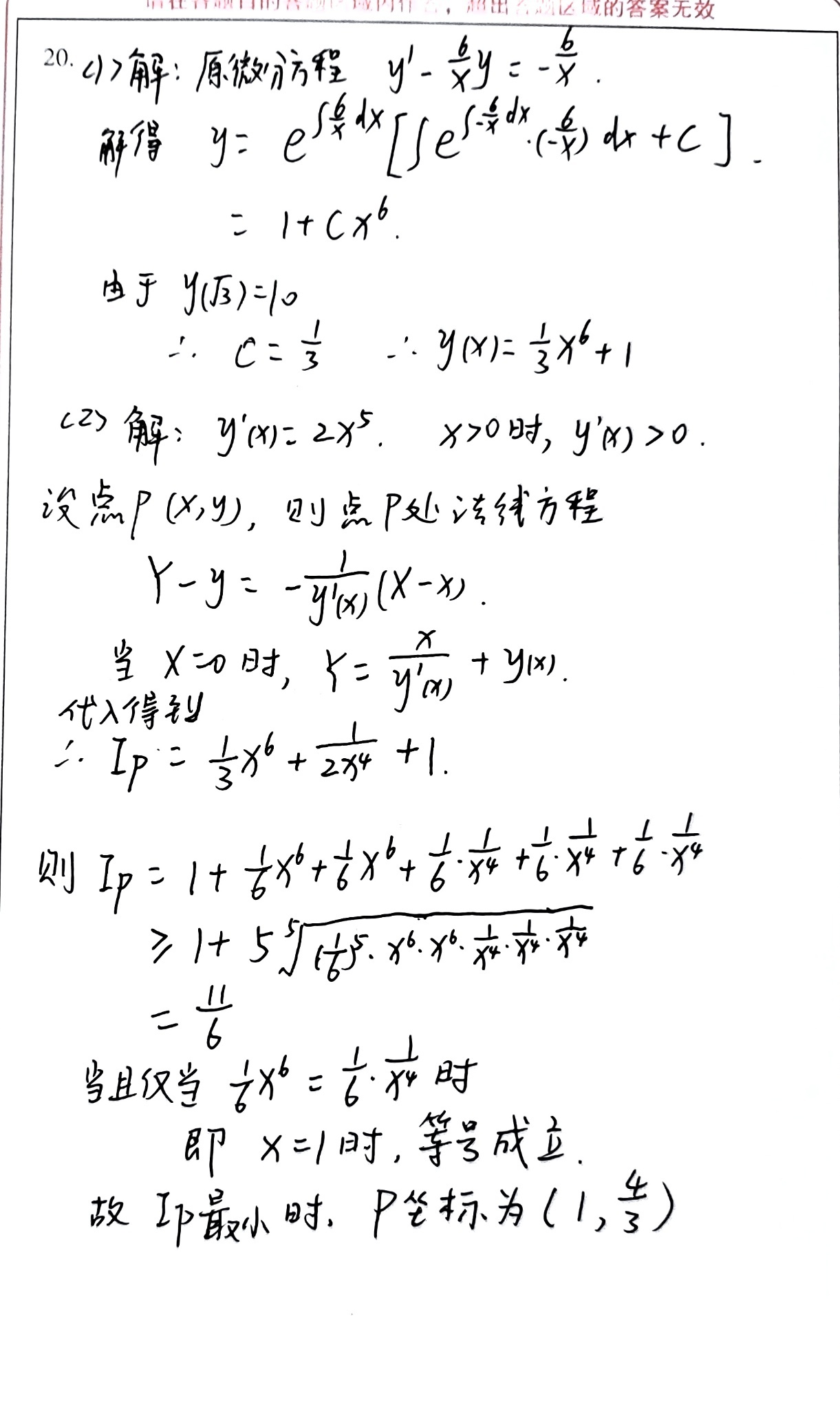 学生正确计算导数 \(y'(x) = 2x^5\),建立法线方程,并正确求出法线在y轴截距 \(I_P = 1 + \frac{1}{3}x^6 + \frac{1}{2x^4}\)。但在后续求最小值时,采用了均值不等式方法,将表达式拆分为6项: