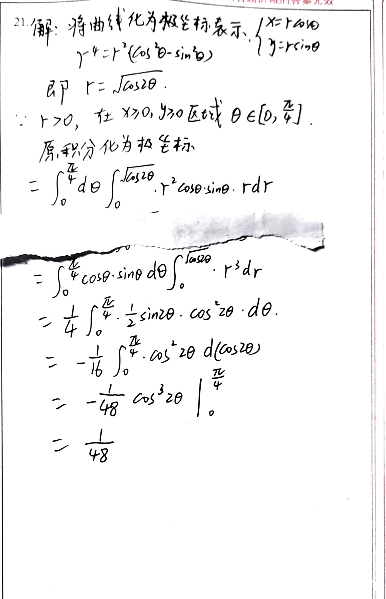 - 正确写出极坐标下的二重积分表达式 \(\int_{0}^{\frac{\pi}{4}} d\theta \int_{0}^{\sqrt{\cos 2\theta}} r^3 \cos\theta \sin\theta dr\)
