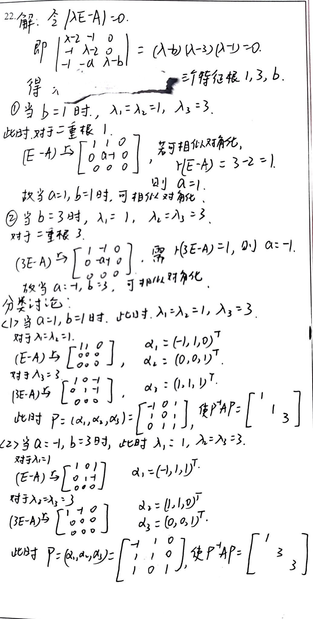 - 当a=-1,b=3时:特征向量(-1,1,1)ᵀ、(1,1,0)ᵀ、(0,0,1)ᵀ正确,矩阵P构造正确