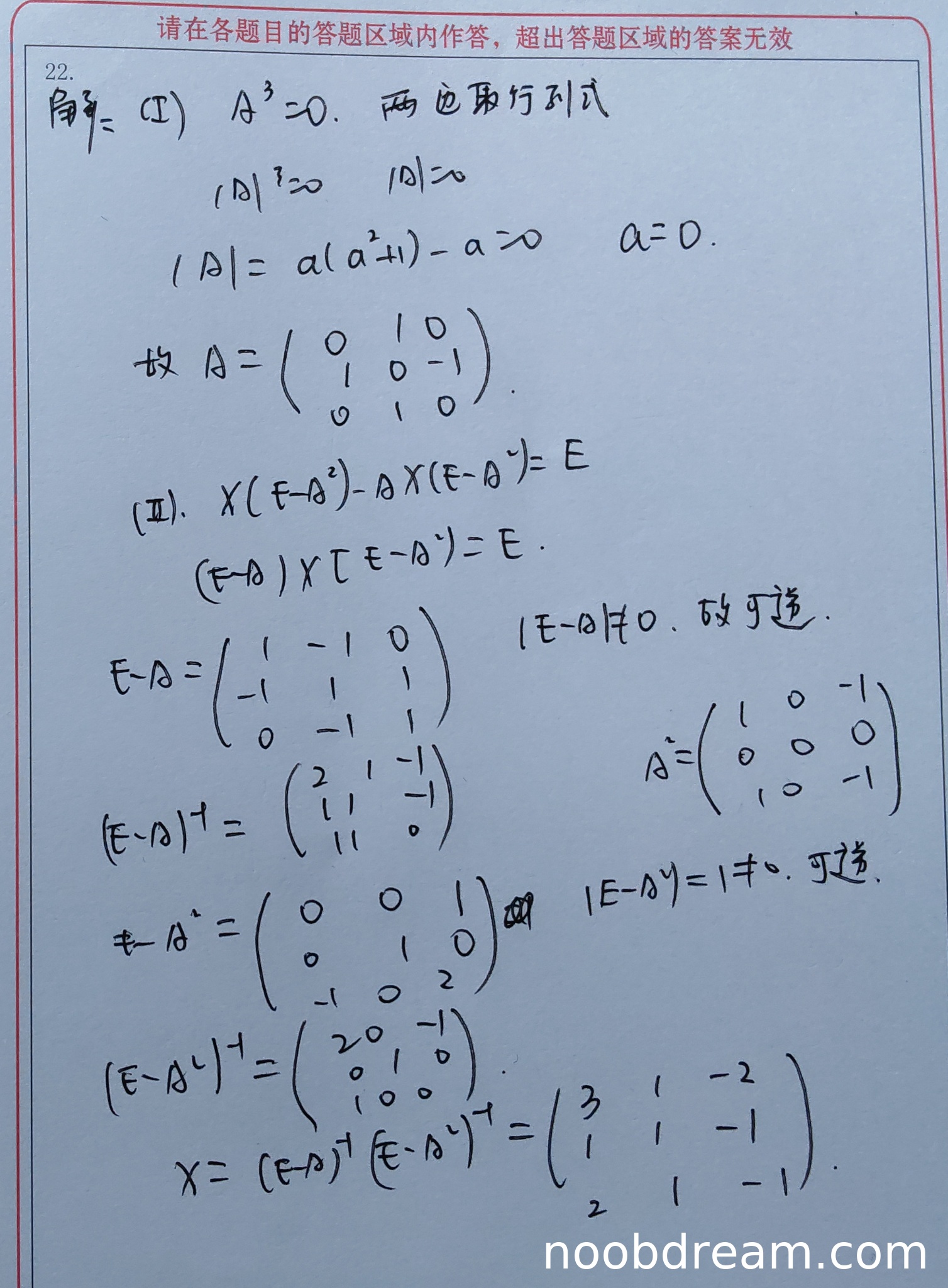学生正确利用A³=O推出|A|=0,并计算行列式得到a=0,与标准答案一致。计算过程正确,得满分5分。