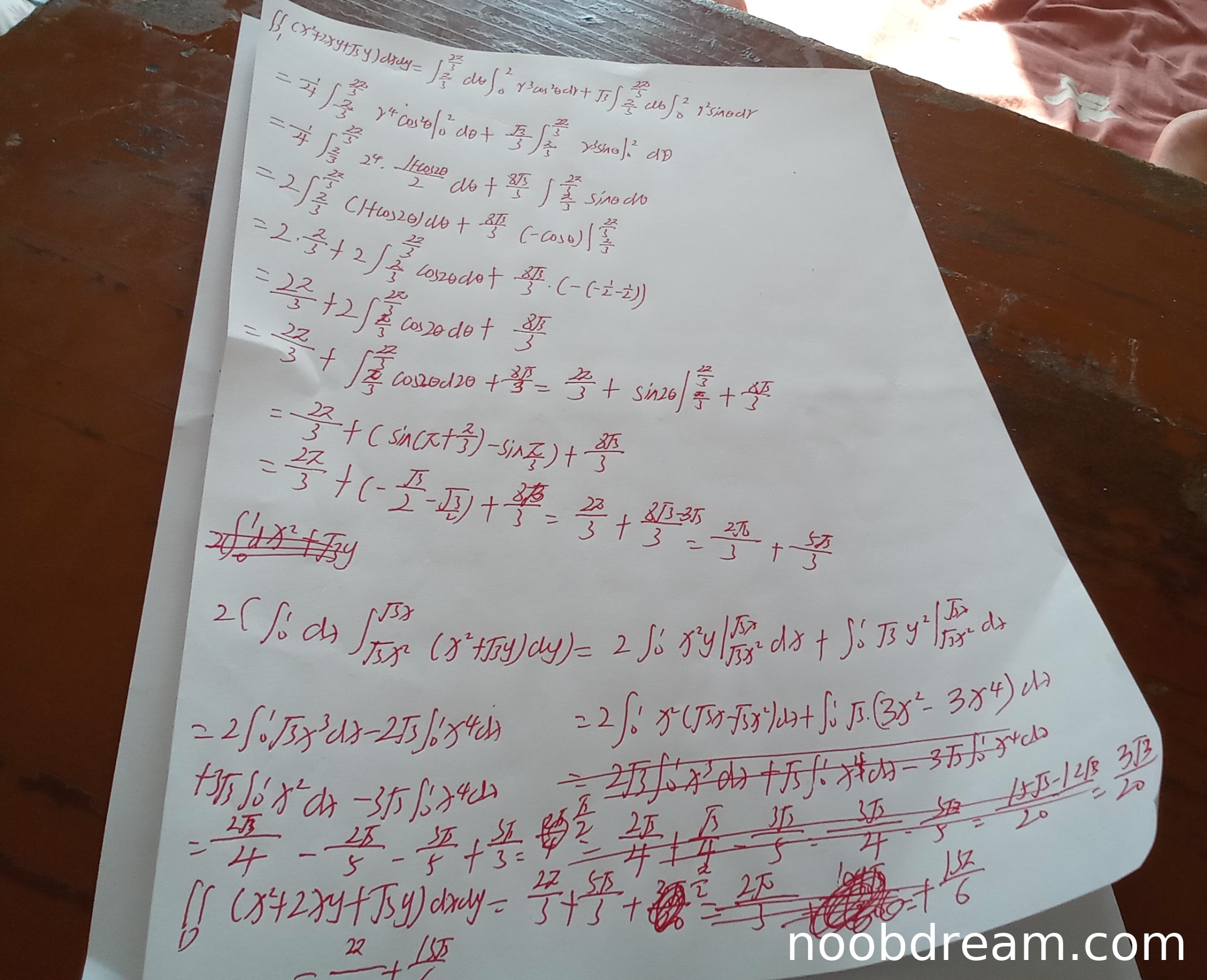 扣分:区域理解错误(-4分),积分上下限错误(-4分),计算过程混乱(-2分),最终答案错误(-2分)。