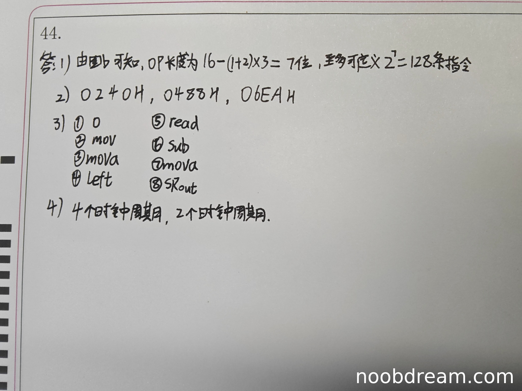 学生回答正确,指出OP长度为7位,最多可定义128条指令。得1分。