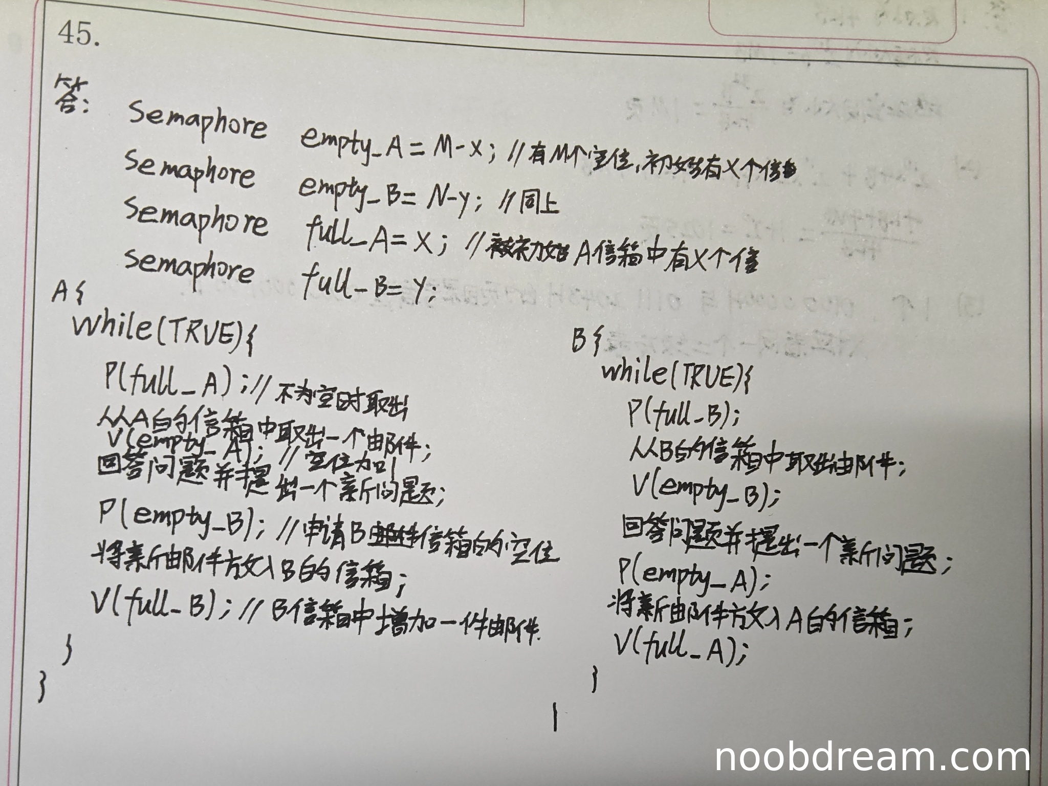 理由:A进程中缺少对A信箱的互斥保护,没有使用mutex_A信号量。同步操作顺序基本正确,但缺少互斥操作会导致对信箱的并发访问出现问题。扣1.5分。