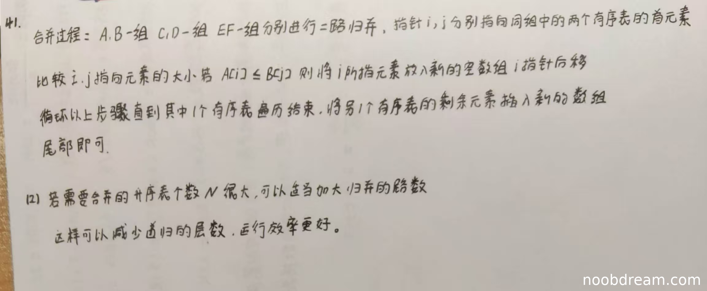 学生描述的策略是分组进行二路归并,并提到若N很大可加大归并路数以减少递归层数。但题目要求针对不等长升序表的合并策略,标准答案强调应借用哈夫曼树思想选择最短表优先合并。学生未提及表长差异对比较次数的影响,也未说明优先合并短表的理由,因此未能准确描述合并策略。根据标准答案评分说明,采用其他策略但能完成合并给2分,但学生描述过于简略且未突出关键思想,扣1分。因此本部分得1分。
