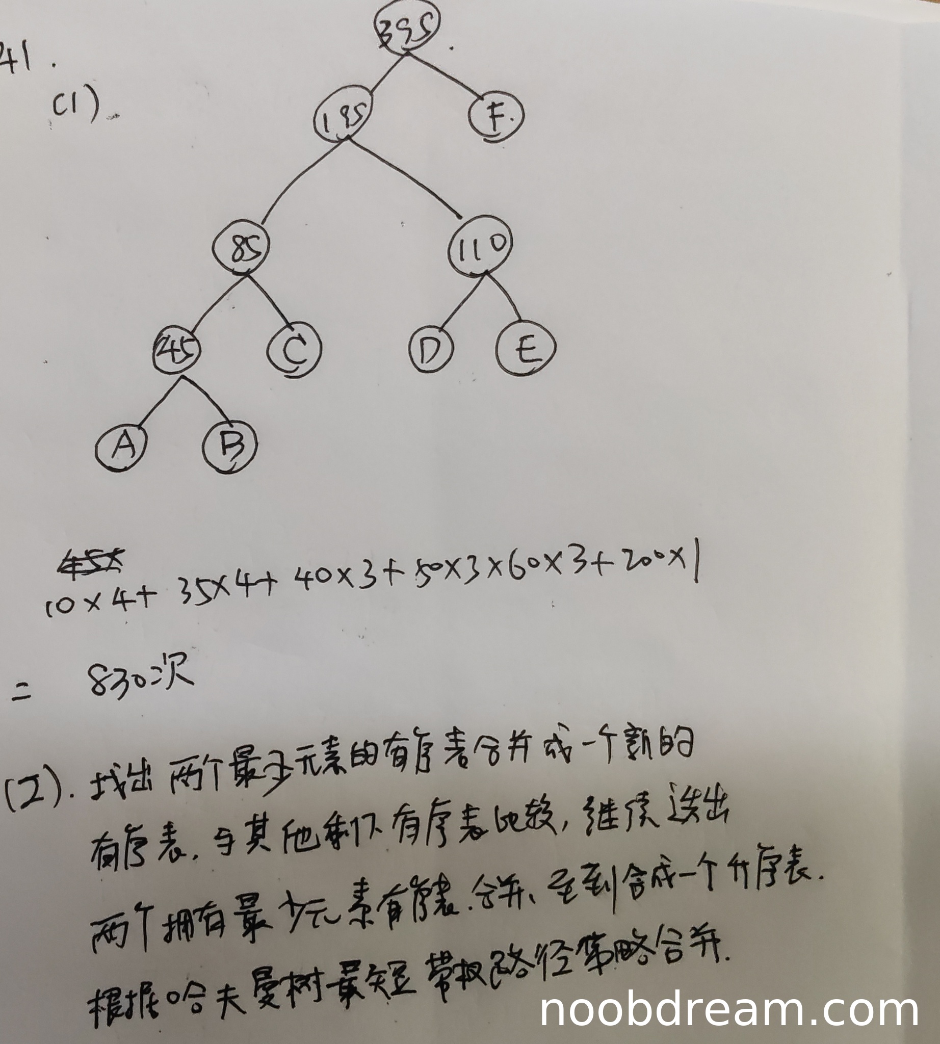学生给出的合并过程不完整,没有明确列出每次合并的具体表对和顺序,仅通过哈夫曼树思想计算了总比较次数为830次。标准答案中完整的合并过程为:A+B→AB(45), AB+C→ABC(85), D+E→DE(110), ABC+DE→ABCDE(195), ABCDE+F→最终表(395),并计算最坏比较总次数为825次。学生计算的总次数830次与标准答案825次不符,但计算思路正确(采用哈夫曼树权重路径计算),且过程描述中隐含了哈夫曼合并策略。根据评分说明,过程描述不完整但策略正确给3分,计算过程正确但结果错误给1分,因此本小题得4分。