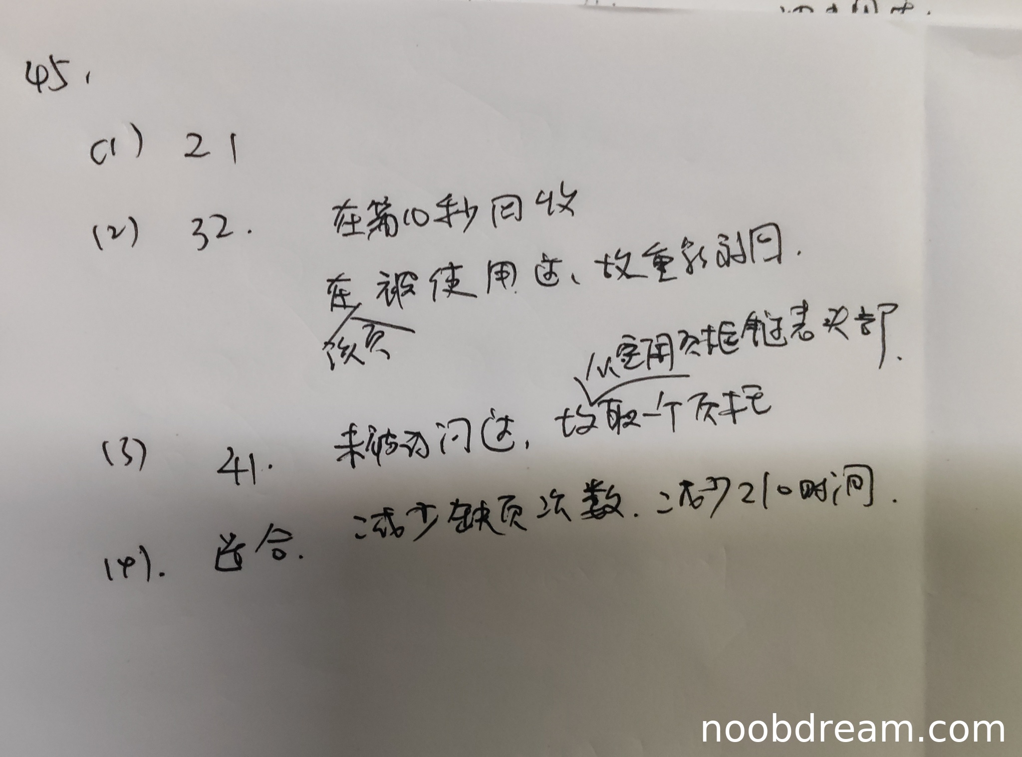 学生答案:41。理由部分提到“未被访问,放取一个页框”,虽然表述简略,但正确指出该页从未被访问过,需从空闲链表中取页框。得2分。