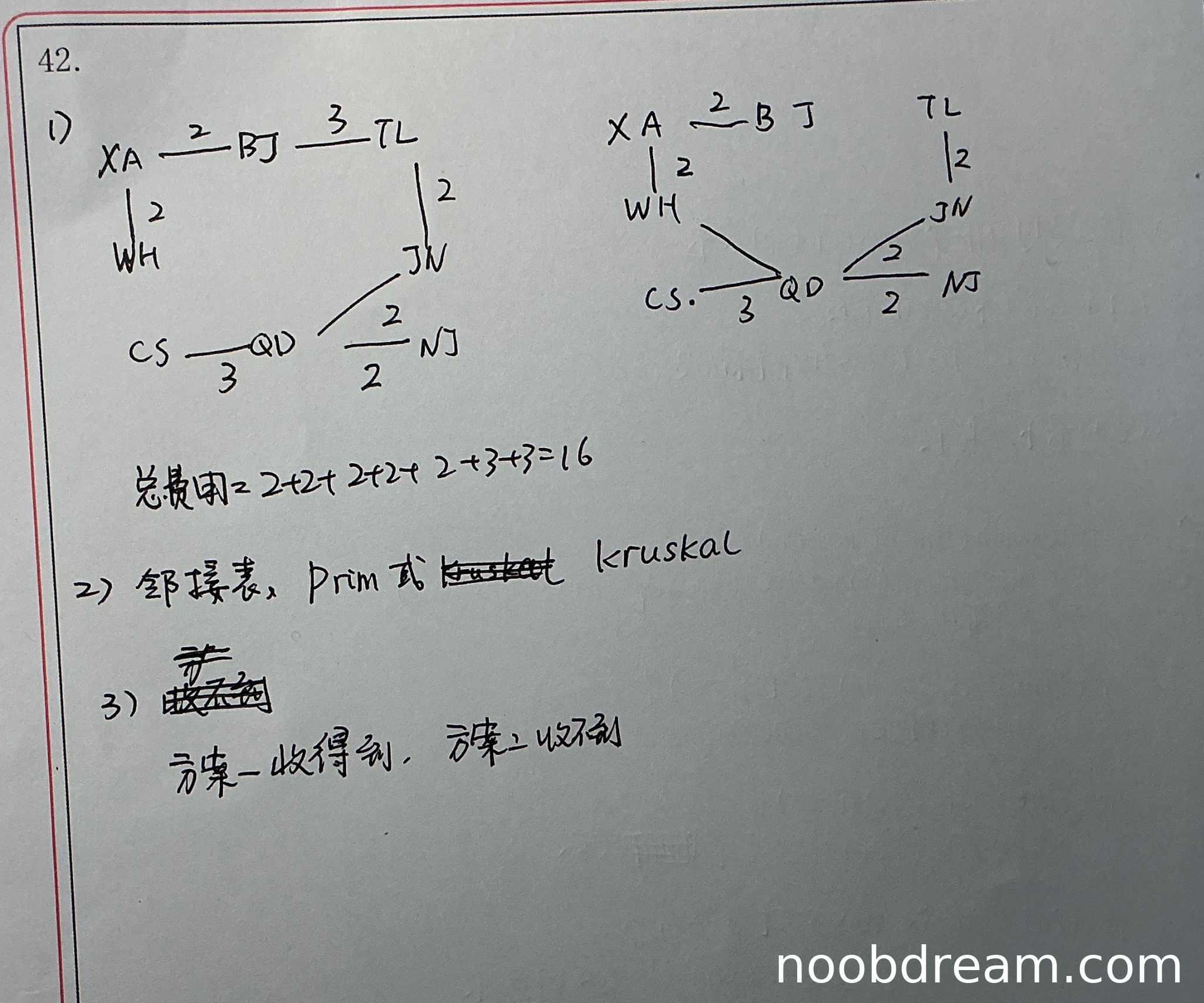 学生给出了最小生成树的边列表形式,并计算总费用为16,与标准答案一致。但学生作答中出现了重复边(XA→BJ、XA→WH各出现两次),且边列表组织不够清晰,但核心内容正确。因此扣1分。
