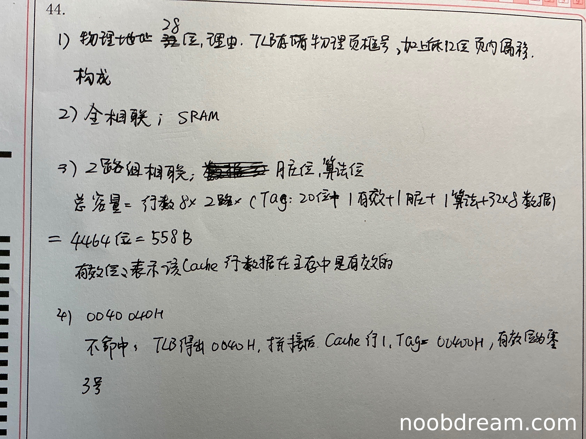 学生答案:物理地址28位,理由:TLB存储物理页框号,加上低12位页内偏移构成。