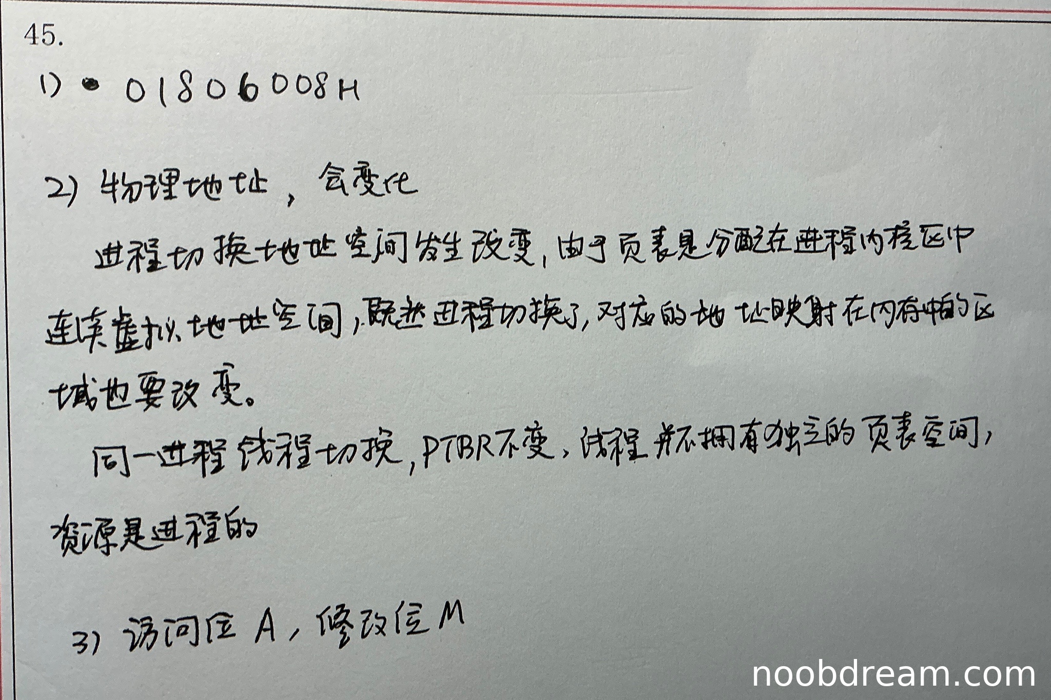 第三问:学生回答"PTBR不变"正确(虽然写成了PTBR而非PDBR,但根据上下文判断应为笔误),解释"线程并不拥有独立的页表空间,资源是进程的"正确,得1分。