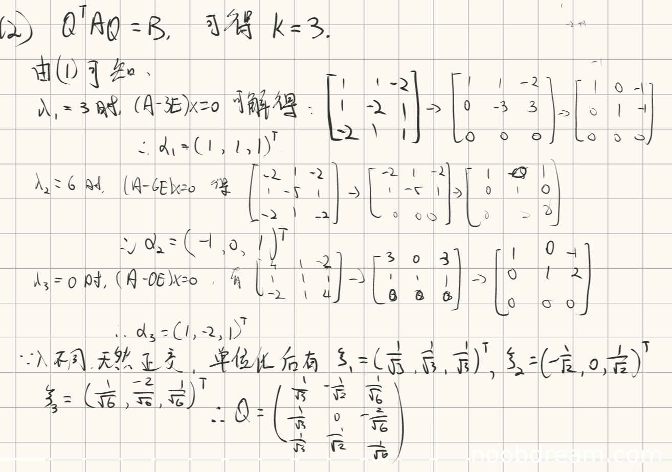 学生正确指出当存在正交矩阵Q时,A与B相似,故k=3。并正确计算了三个特征值对应的特征向量,但未进行单位化处理。最后给出的Q矩阵是未单位化的特征向量组成的矩阵,不符合正交矩阵要求。此处计算思路正确,但未完成单位化步骤,扣2分。得4分。