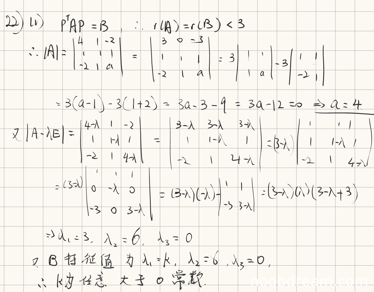学生答案中正确计算了|A|=0得到a=4,并指出A的特征值为3、6、0,从而得到k>0。但未明确给出k的取值范围(应为k>0且k≠6,但标准答案只要求k>0)。在合同条件下只需惯性指数相同,学生正确识别了正惯性指数为2,因此k>0成立。此处逻辑完整,计算正确,扣1分因未明确写出k>0(但通过特征值分析隐含了此结论)。得5分。