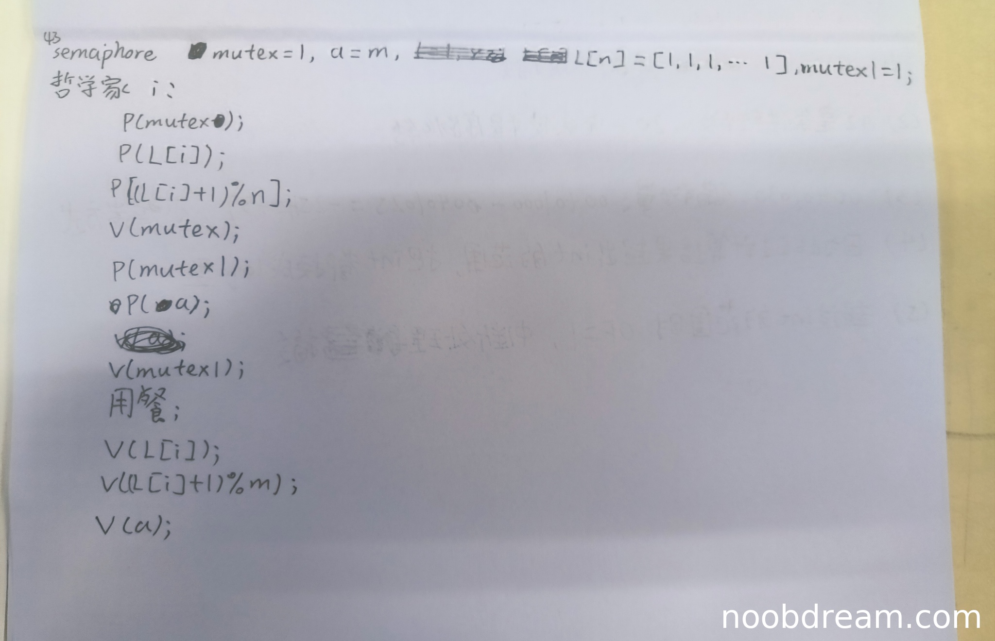 理由:学生定义了碗的信号量a(初值m)和筷子信号量数组L[n](初值全1),这部分正确。但额外定义了mutex和mutex1两个互斥信号量,这是不必要的,且mutex1用于保护碗的信号量操作,实际上碗的信号量操作本身是原子的,不需要额外保护。由于多定义了不必要的信号量,扣1分。