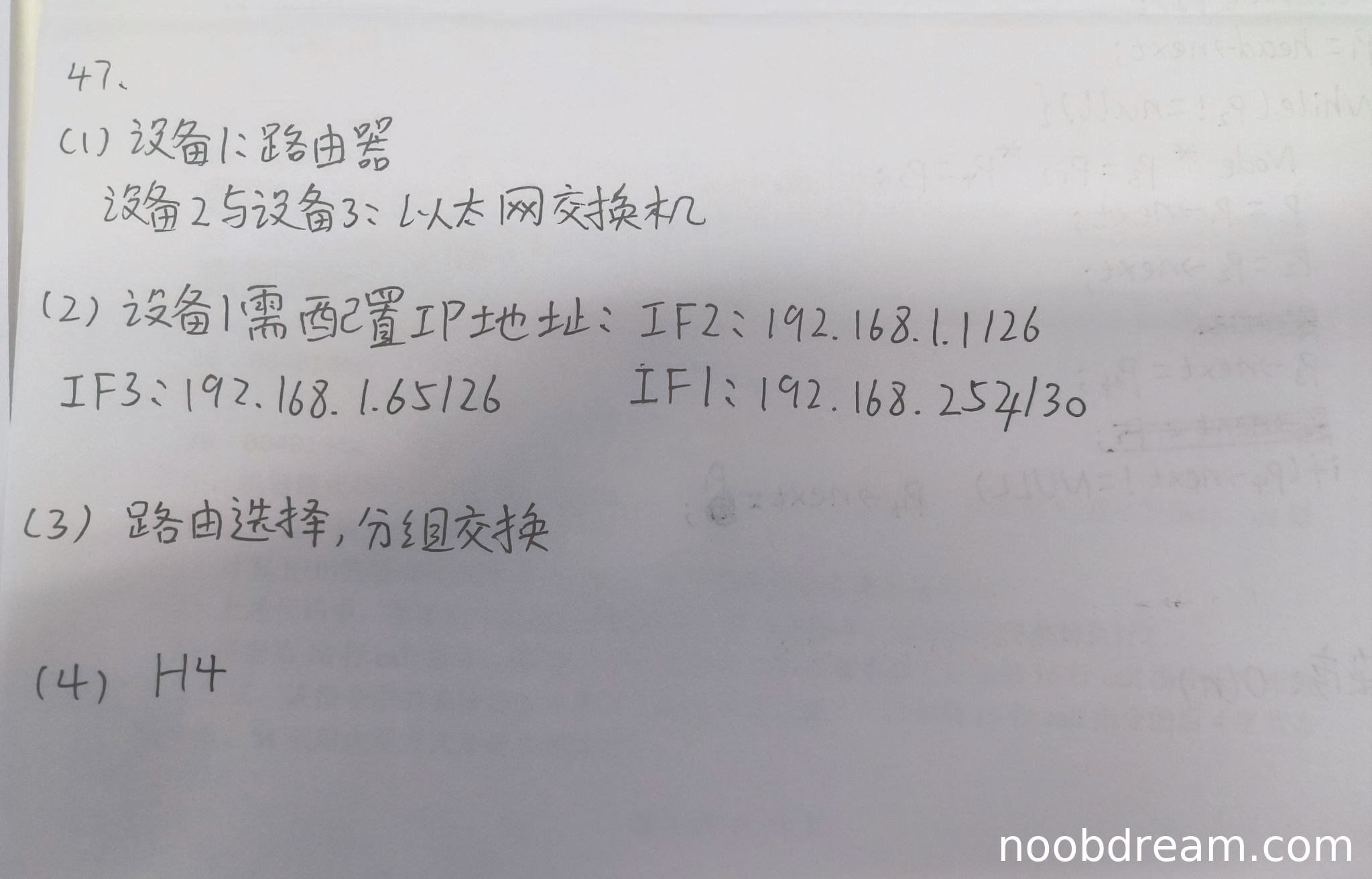 学生答案:设备1为路由器,设备2与设备3为以太网交换机,与标准答案完全一致。得3分。
