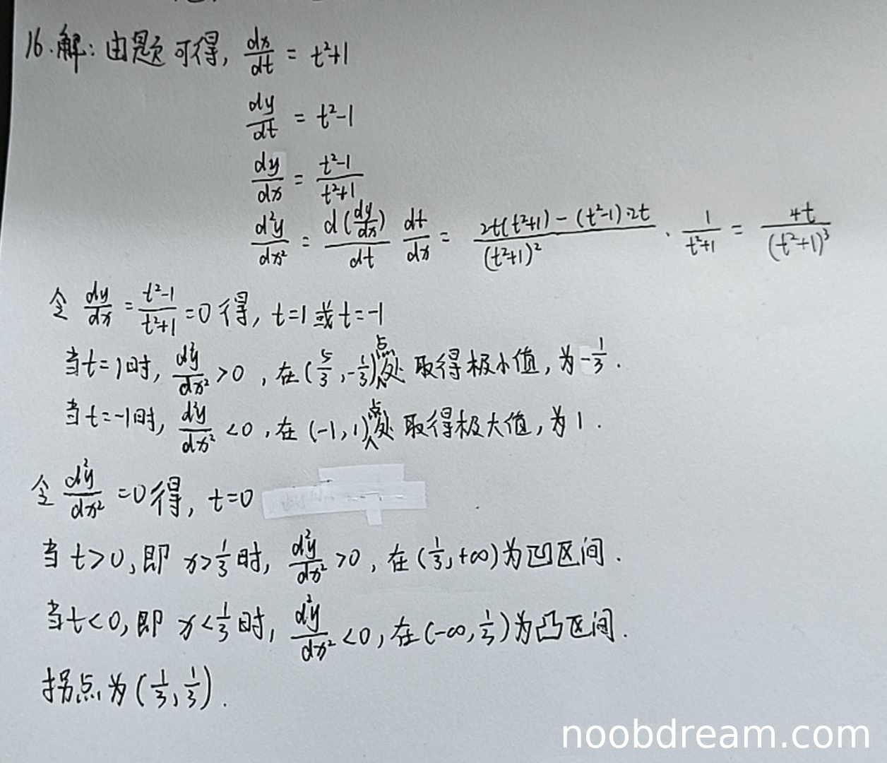 理由:学生正确计算了一阶导数 \(\frac{dy}{dx}=\frac{t^2-1}{t^2+1}\) 和二阶导数 \(\frac{d^2y}{dx^2}=\frac{4t}{(t^2+1)^3}\),推导过程完整无误。
