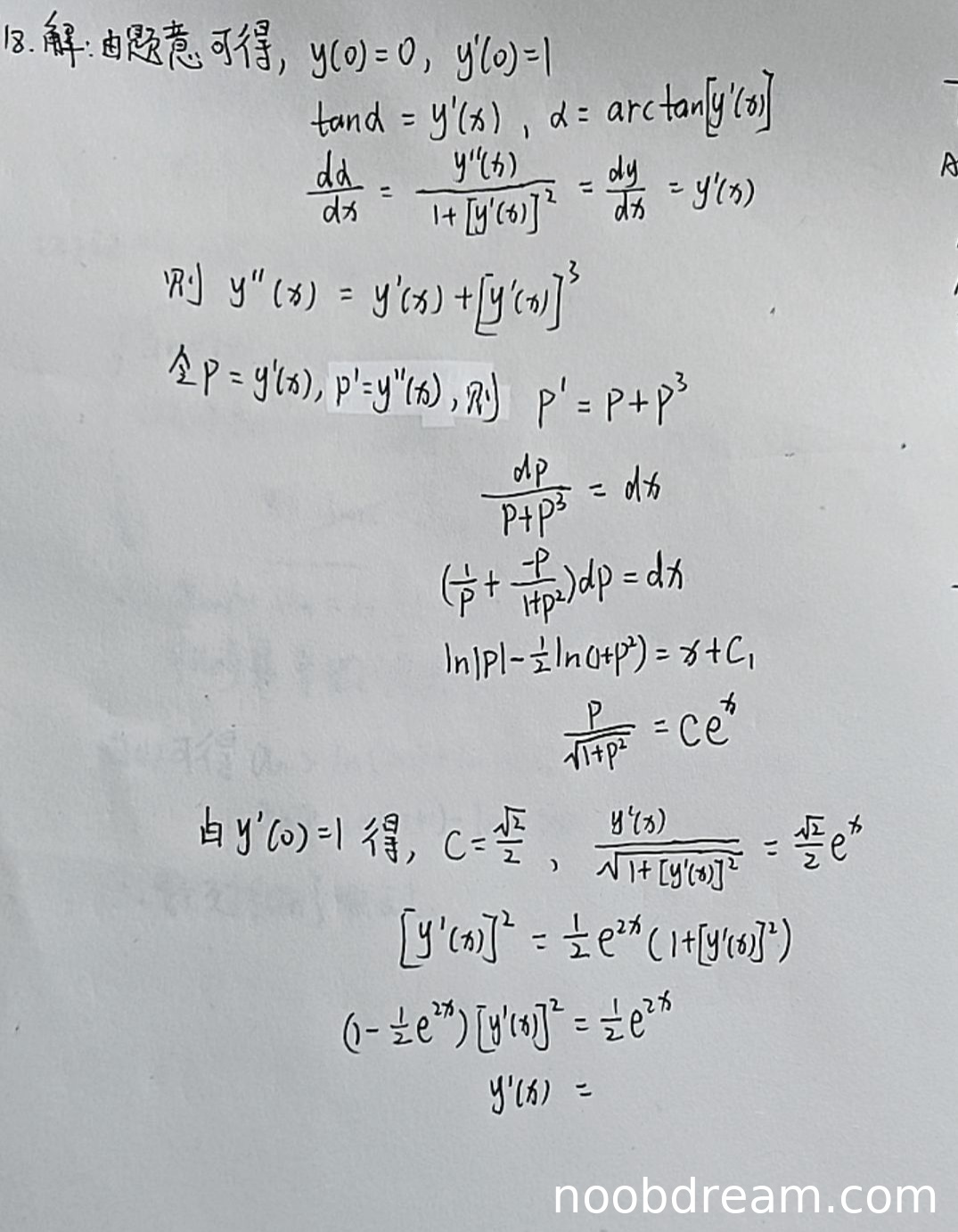学生正确写出初始条件 \( y(0) = 0 \)、\( y'(0) = 1 \)(1分)。正确建立 \(\tan\alpha = y'(x)\) 并推导出 \(\frac{d\alpha}{dx} = \frac{y''(x)}{1 + [y'(x)]^2}\)(2分)。正确代入条件 \(\frac{d\alpha}{dx} = \frac{dy}{dx}\) 得到微分方程 \(y''(x) = y'(x) + [y'(x)]^3\)(2分)。正确令 \(P = y'(x)\) 并化为 \(\frac{dP}{P + P^3} = dx\)(1分)。积分过程正确得到 \(\ln|P| - \frac{1}{2}\ln(1 + P^2) = x + C_1\)(1分)。正确代入初始条件 \(y'(0) = 1\) 解得 \(C = \frac{\sqrt{2}}{2}\)(1分)。但最终未解出 \(y(x)\) 的表达式,且最后一步代数运算未完成(扣2分)。