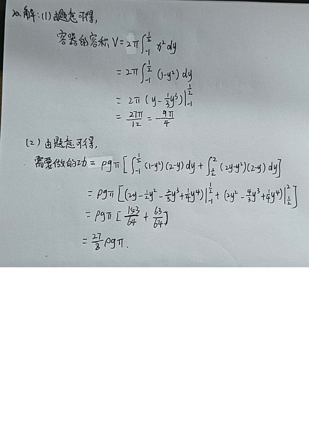 - 积分上下限错误:下半部分应为 \(y\in[0,\frac12]\) 或 \([-1,\frac12]\)?图形中下半圆是 \(x^2+y^2=1\) 且 \(y\le \frac12\),但 y 最小是 -1 还是 0?从图看,容器底部在 y=-1 处,但题目说“由曲线绕 y 轴旋转”,且下面部分 \(y\le \frac12\) 对应 \(x^2+y^2=1\),因此 y 从 -1 到 1/2 是合理的。标准答案里下半部分积分区间是 \([\frac12,1]\) 吗?不对,标准答案下半部分对应 \(y\le \frac12\) 的球缺部分,但它是用 \(V=2V_1\) 对称算...