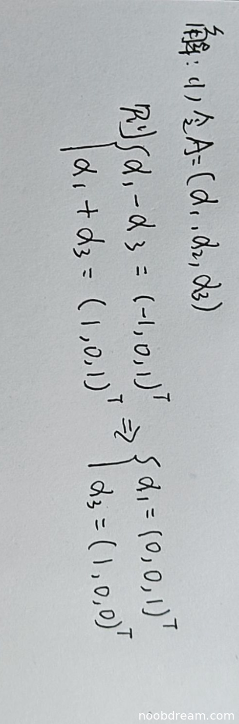 - 学生从 \(\alpha_1 - \alpha_3 = (-1,0,1)^T\) 和 \(\alpha_1 + \alpha_3 = (1,0,1)^T\) 推出 \(\alpha_1 = (0,0,1)^T\) 和 \(\alpha_3 = (1,0,0)^T\),这一步骤与题目中给出的矩阵方程无直接逻辑关联,且未正确识别特征值与特征向量。