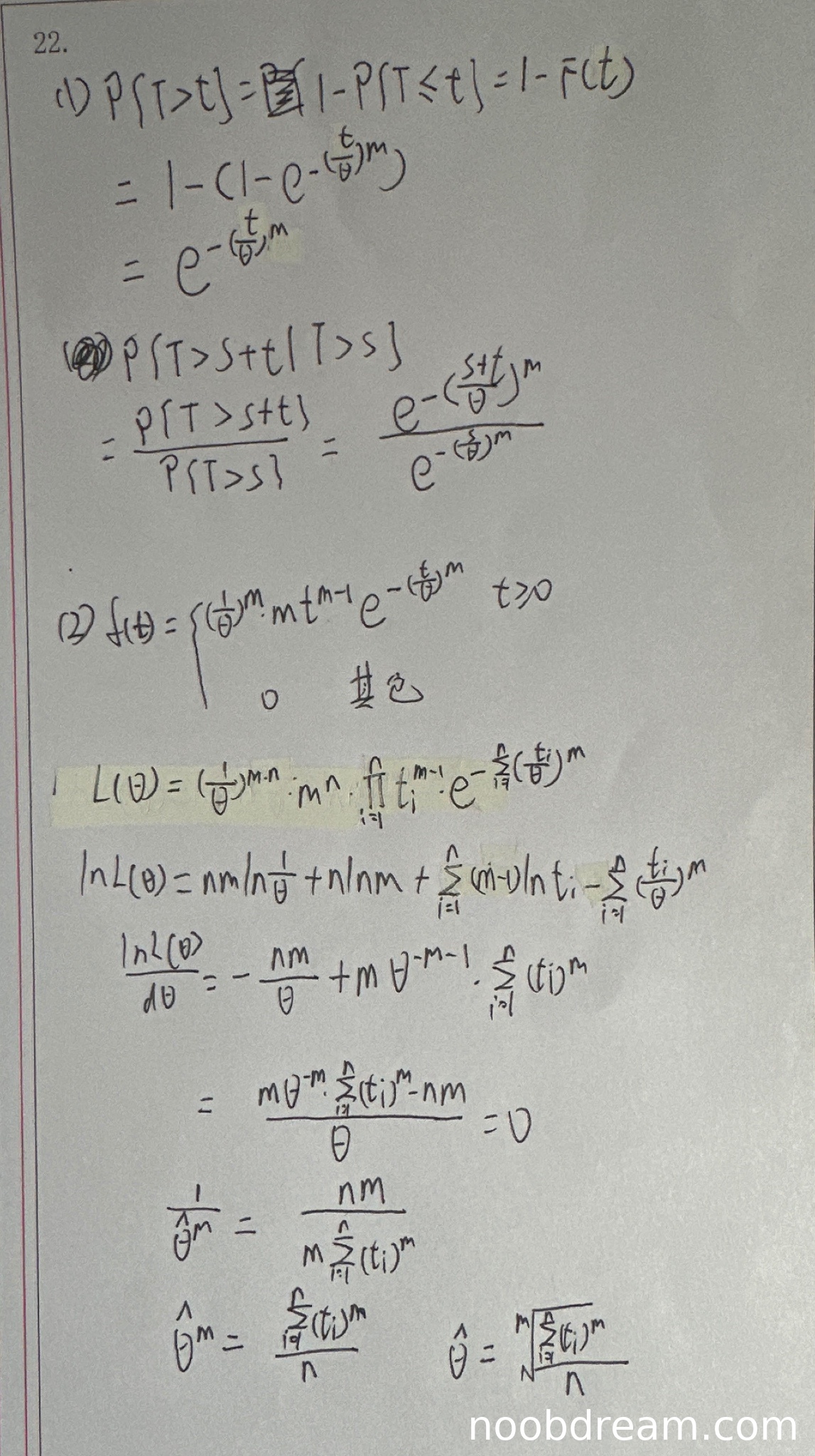 正确构造似然函数 \(L(\theta) = (\frac{1}{\theta})^{mn} m^n \prod t_i^{m-1} e^{-\sum (t_i/\theta)^m}\),得1分。