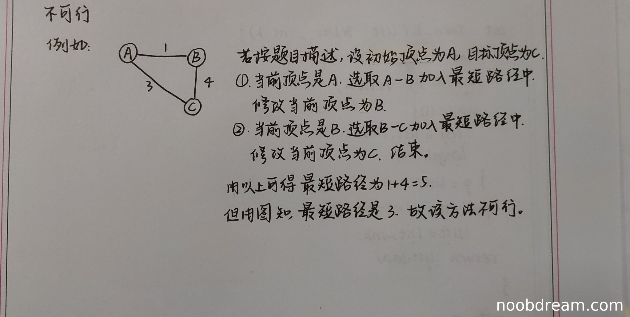 学生正确判断出该方法不可行,并给出了反例说明。在反例中,学生描述了从A到C的路径选择过程:先选A-B(距离1),再选B-C(距离4),总距离5,但实际最短路径是3(A-D-C)。这个逻辑与标准答案中的反例本质一致,只是具体数值略有不同(标准答案中B-C距离为10,学生作答中为4),但都正确展示了贪心策略的局限性。