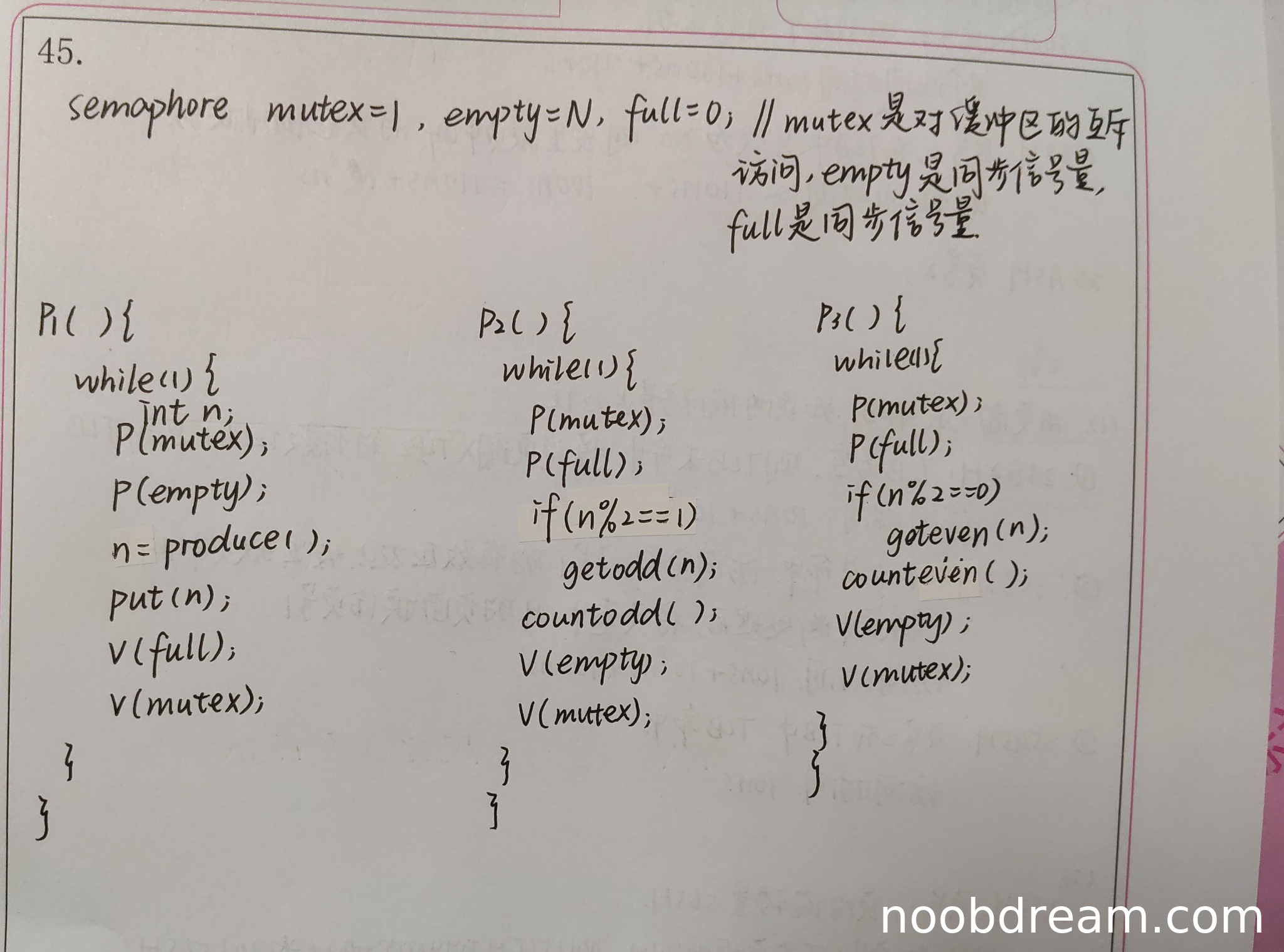 理由:P2进程有取奇数和统计的功能,但存在严重逻辑错误:在P(full)之前就P(mutex),可能导致死锁;使用全局变量n而不是从缓冲区获取数据;if语句缺少大括号。扣除1分。