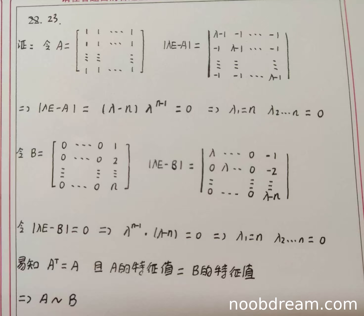 学生正确计算了矩阵B的特征多项式,得到特征值λ₁=n, λ₂=⋯=λₙ=0。得2分。