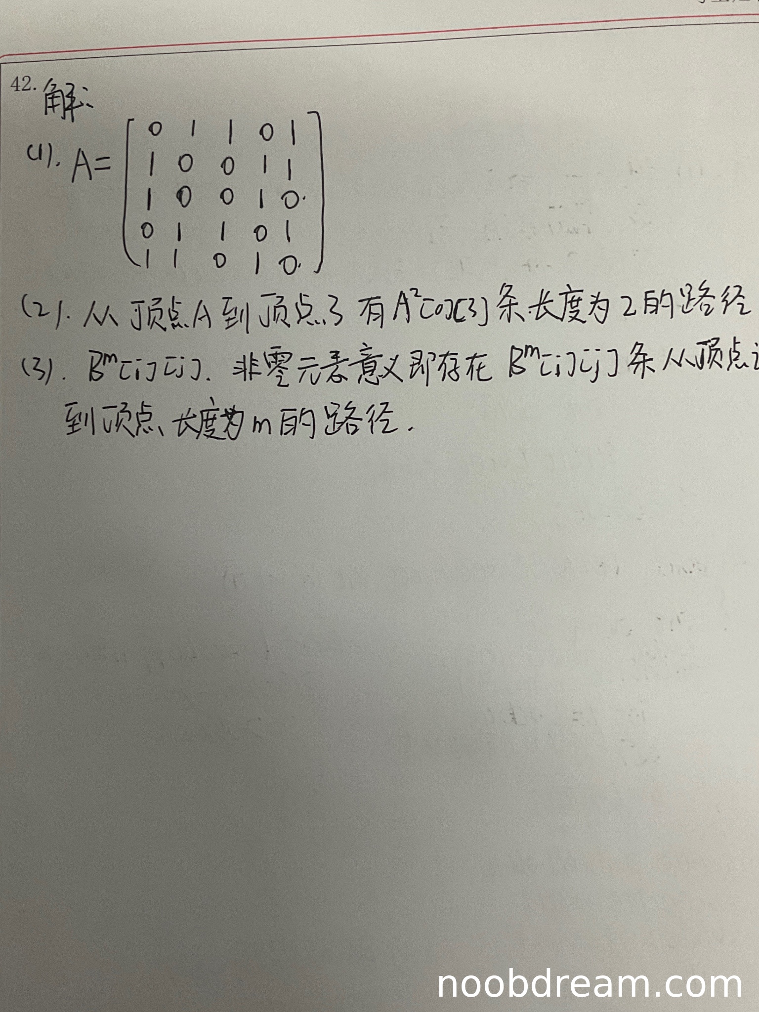 学生没有计算具体的A²矩阵,但正确解释了A²[0][3]的含义为"从顶点0到顶点3长度为2的路径条数"。虽然答案中写的是"顶点A"而不是"顶点0",但根据上下文可以判断这是识别错误或笔误。核心概念正确,因此得3分。