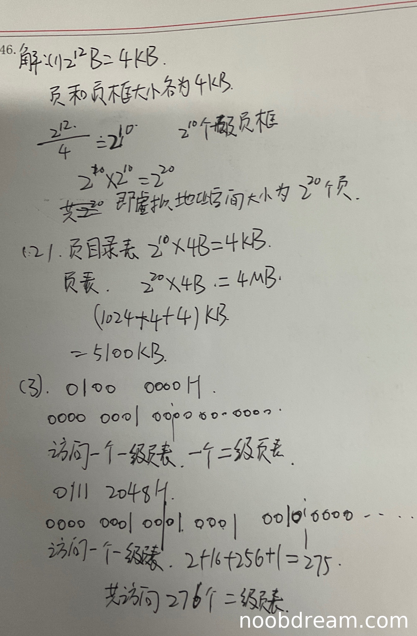 学生未能正确理解二级页表的工作机制。对于虚拟地址01000000H和01112048H,学生错误地认为需要访问多个二级页表。实际上,两个地址的页目录号(最高10位)相同,均为4(二进制0000000100),因此只需访问同一个二级页表。学生答案中关于访问二级页表的数量计算完全错误,本小题得0分。