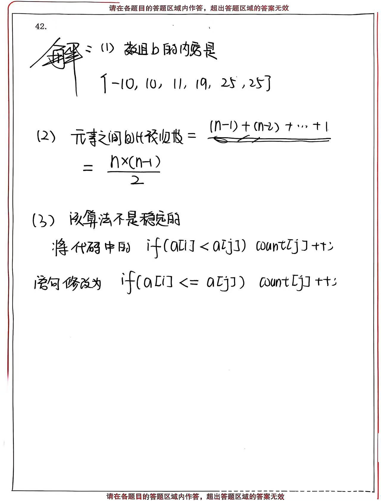 学生正确给出比较次数为n(n-1)/2,虽然公式书写有部分识别错误(如多余的分号),但核心表达式正确,不影响理解。得2分。
