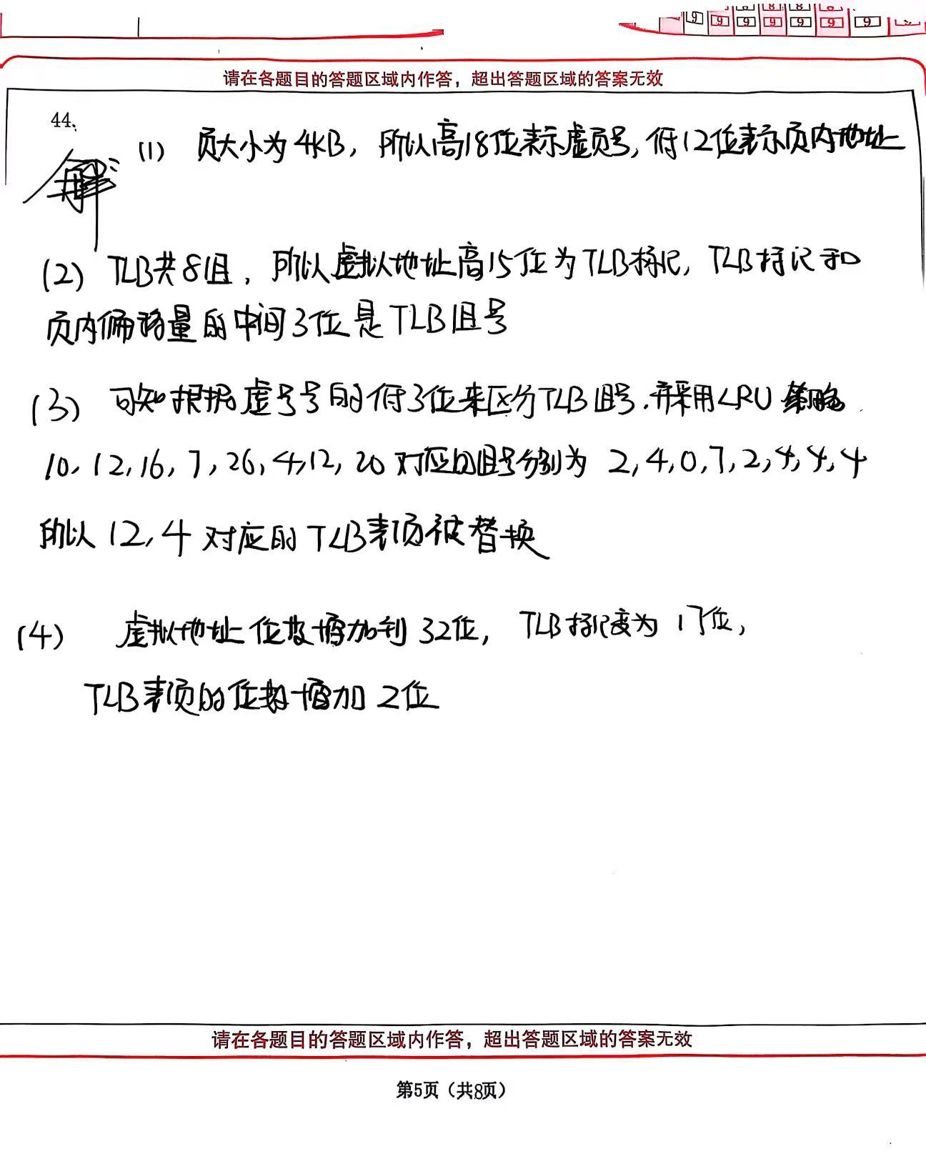 学生正确计算了各虚页号对应的组号(2,4,0,7,2,4,4,4),并指出组4的访问情况。但最终结论"12,4对应的TLB表项被替换"不准确。根据LRU策略,在访问虚页号20时,组4中最早未被访问的虚页号4被替换,学生没有明确说明被替换的是虚页号4,且表述存在歧义。扣1分。得1分。