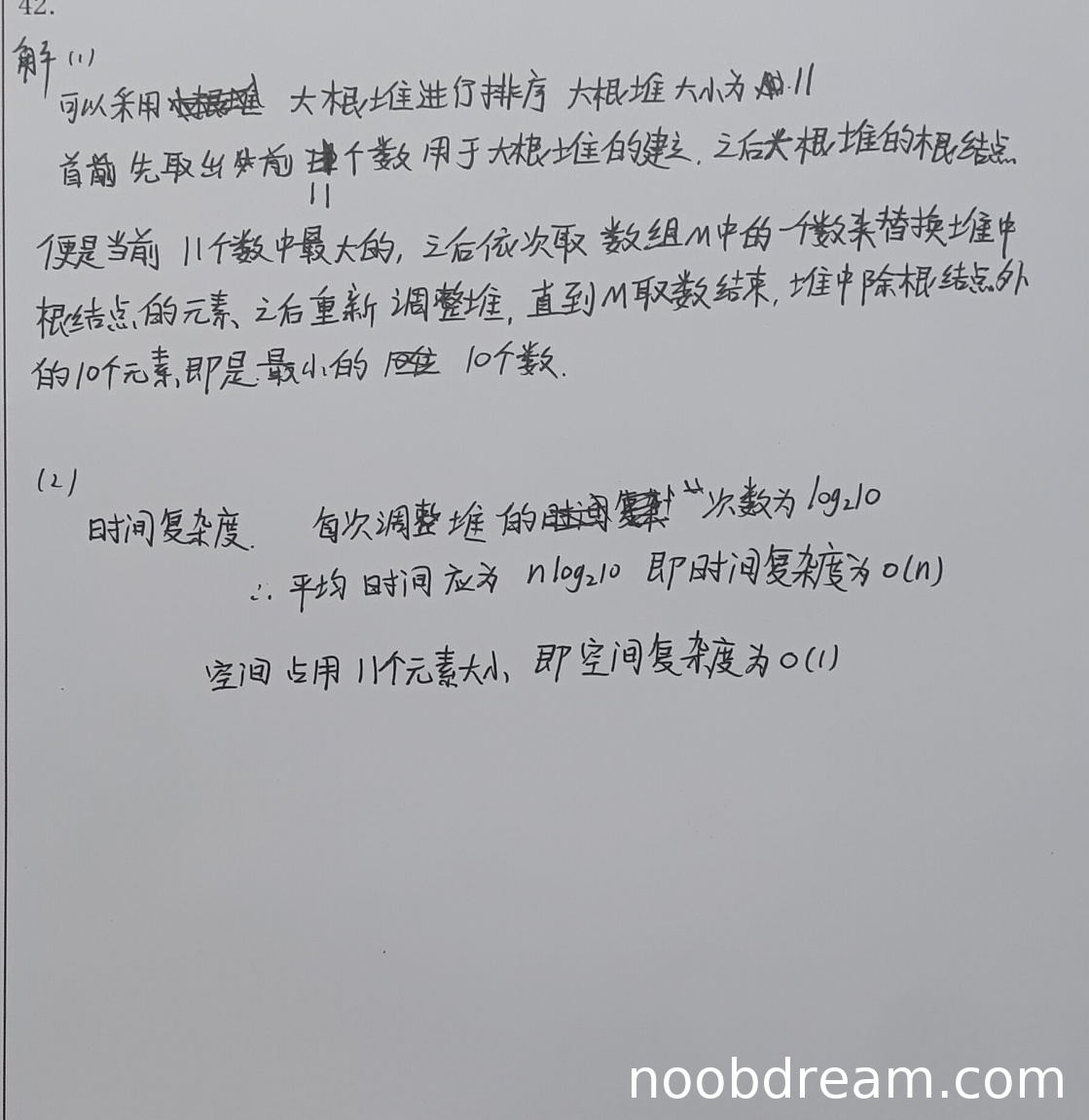 学生正确分析了时间复杂度为O(n)(尽管推导中写为nlog₂10,但log₂10是常数,因此O(n)正确),空间复杂度为O(1)。但基于堆大小错误,时间复杂度推导虽形式有误但结论正确,不扣分;空间复杂度分析中堆大小错误会影响常数项,但O(1)结论正确。因此本部分不扣分。得分:5分。