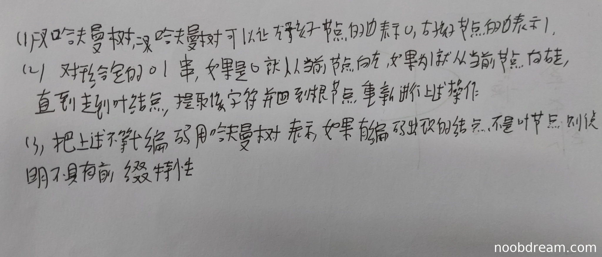 学生描述了从0/1串译码的过程:从根节点开始,根据0向左、1向右移动,直到叶节点提取字符,然后回到根节点重复。这个过程正确且完整,符合前缀编码译码的标准方法。因此得3分。