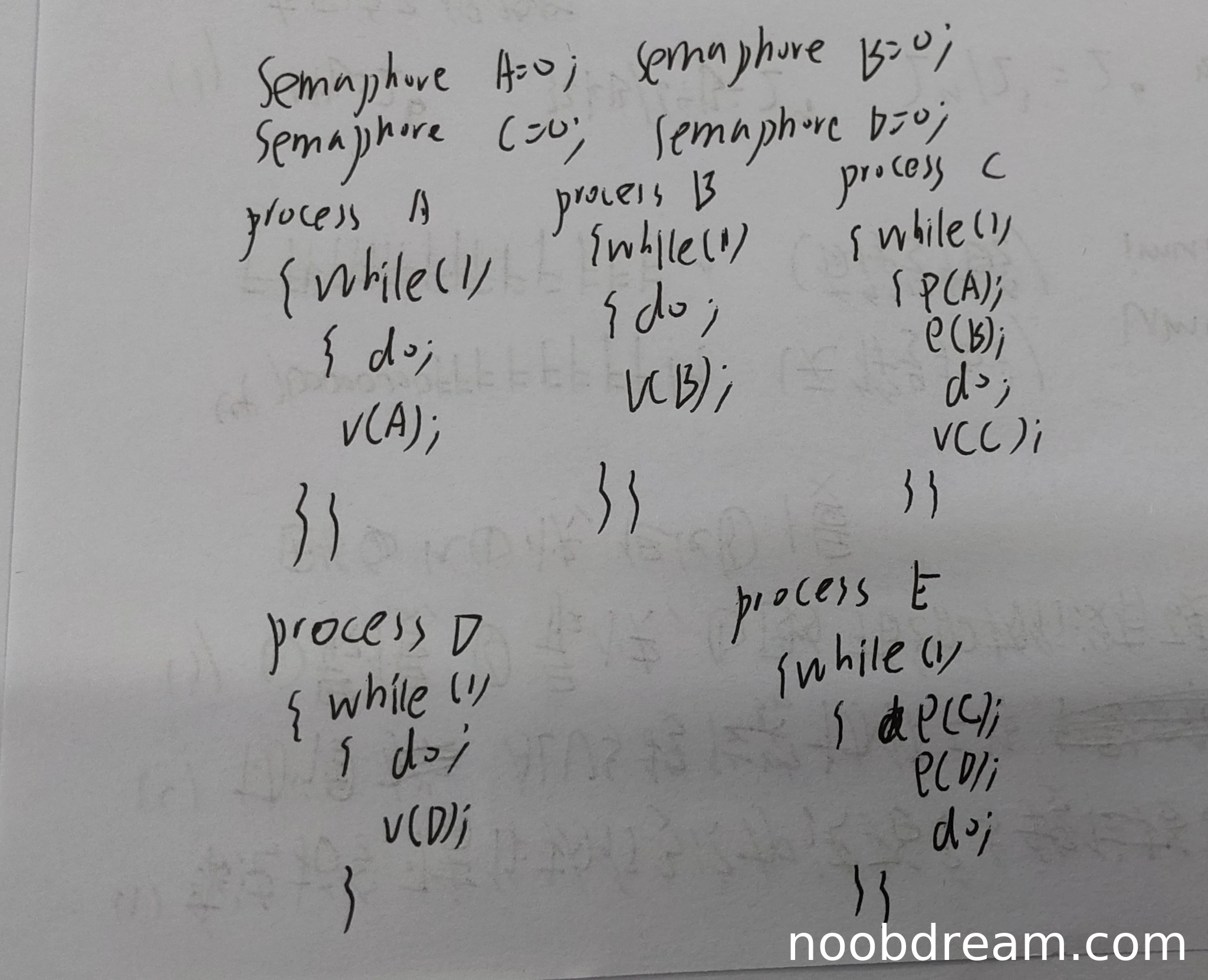 得分:1分。理由:学生定义了四个信号量A、B、C、D,初值均为0,这与标准答案中需要四个信号量(S_AC、S_BC、S_CE、S_DE)的思路一致,但命名不规范(应体现同步关系)。由于信号量数量正确且初值正确,扣1分仅因命名不规范,但根据禁止扣分原则,命名问题不视为逻辑错误,故不扣分。但标准答案中信号量命名明确表示了同步关系,而学生命名过于简单,可能造成混淆,因此酌情扣1分。