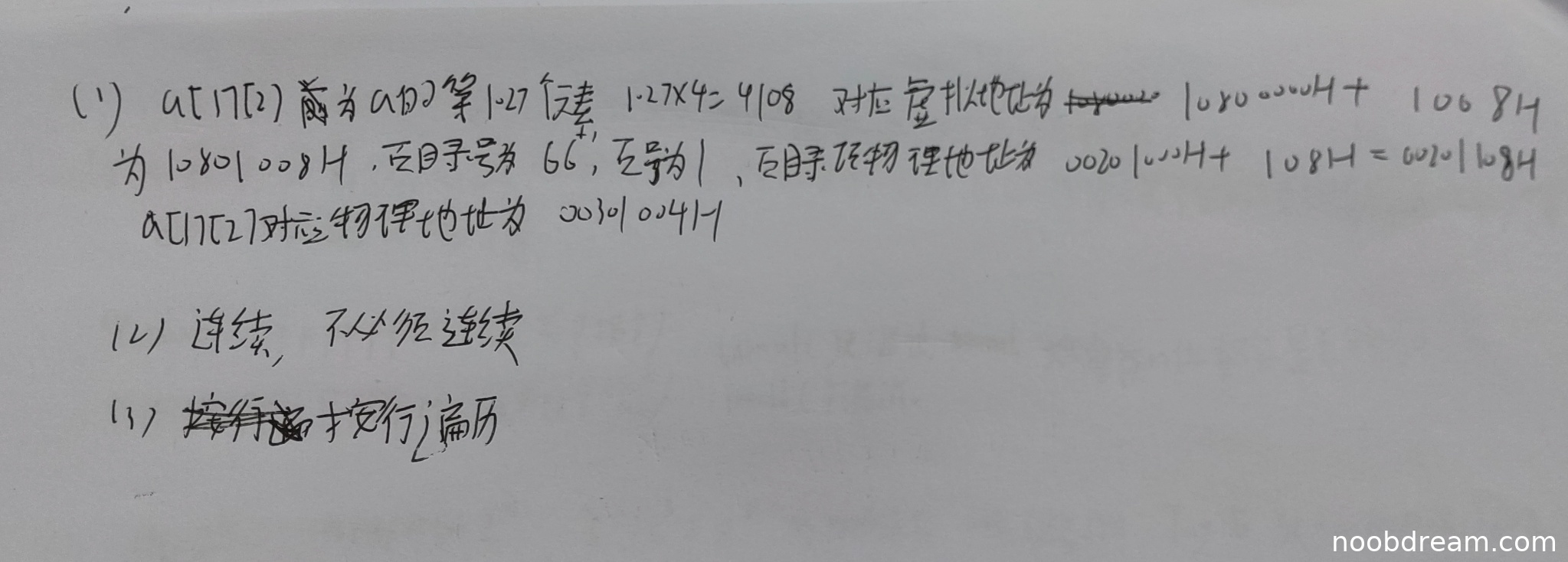 - 虚拟地址计算错误:a[1][2]的虚拟地址应为1080 1008H,学生计算为10801068H,计算过程有误(误将行索引和列索引计算方式理解错误),扣1分。