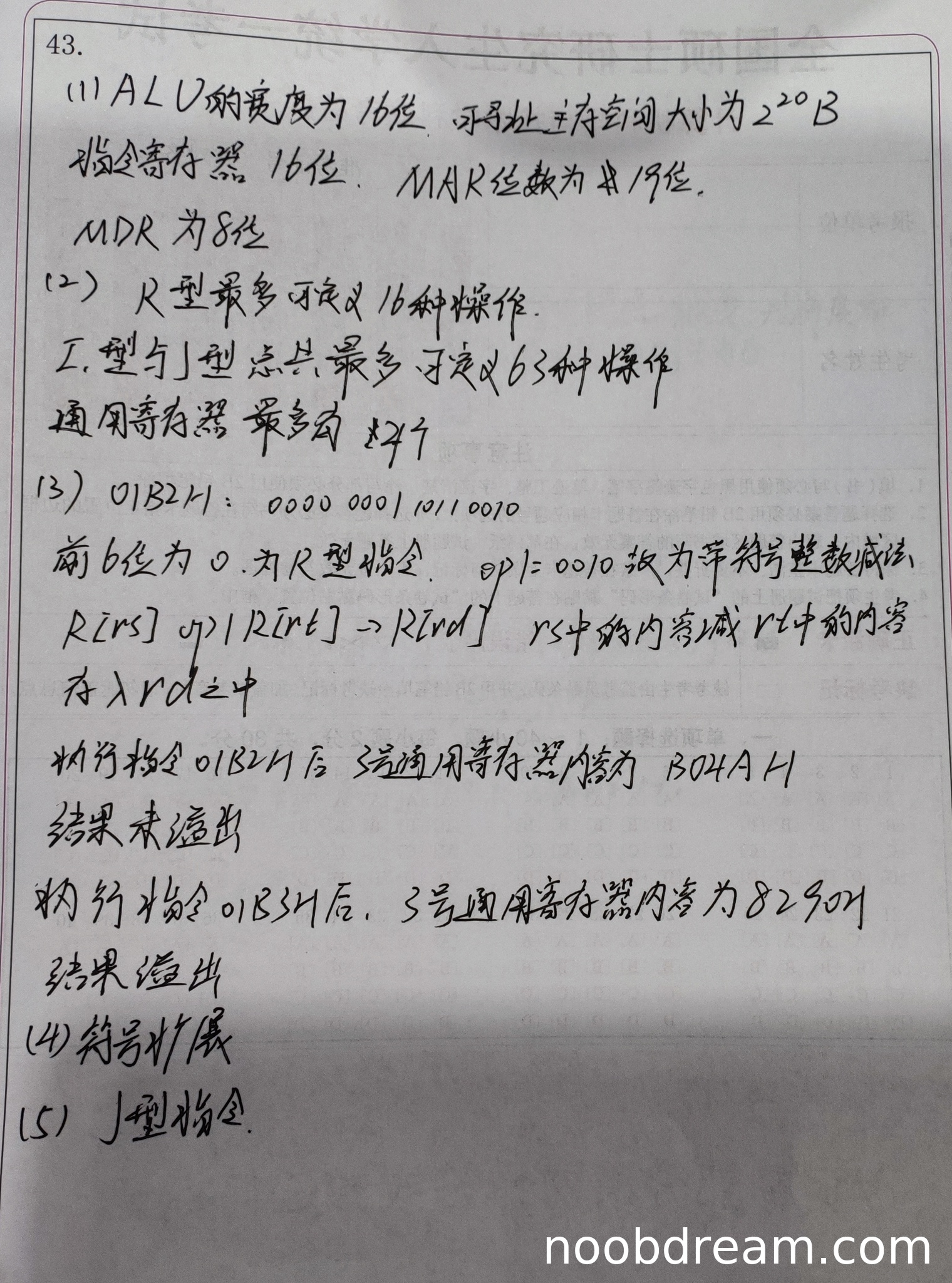 学生答案中,R型最多16种操作正确(1分);I型与J型总共63种操作正确(1分);通用寄存器最多16个错误(标准答案为4个,寄存器编号字段为2位),扣1分。本小题得分:1+1+0=2分。