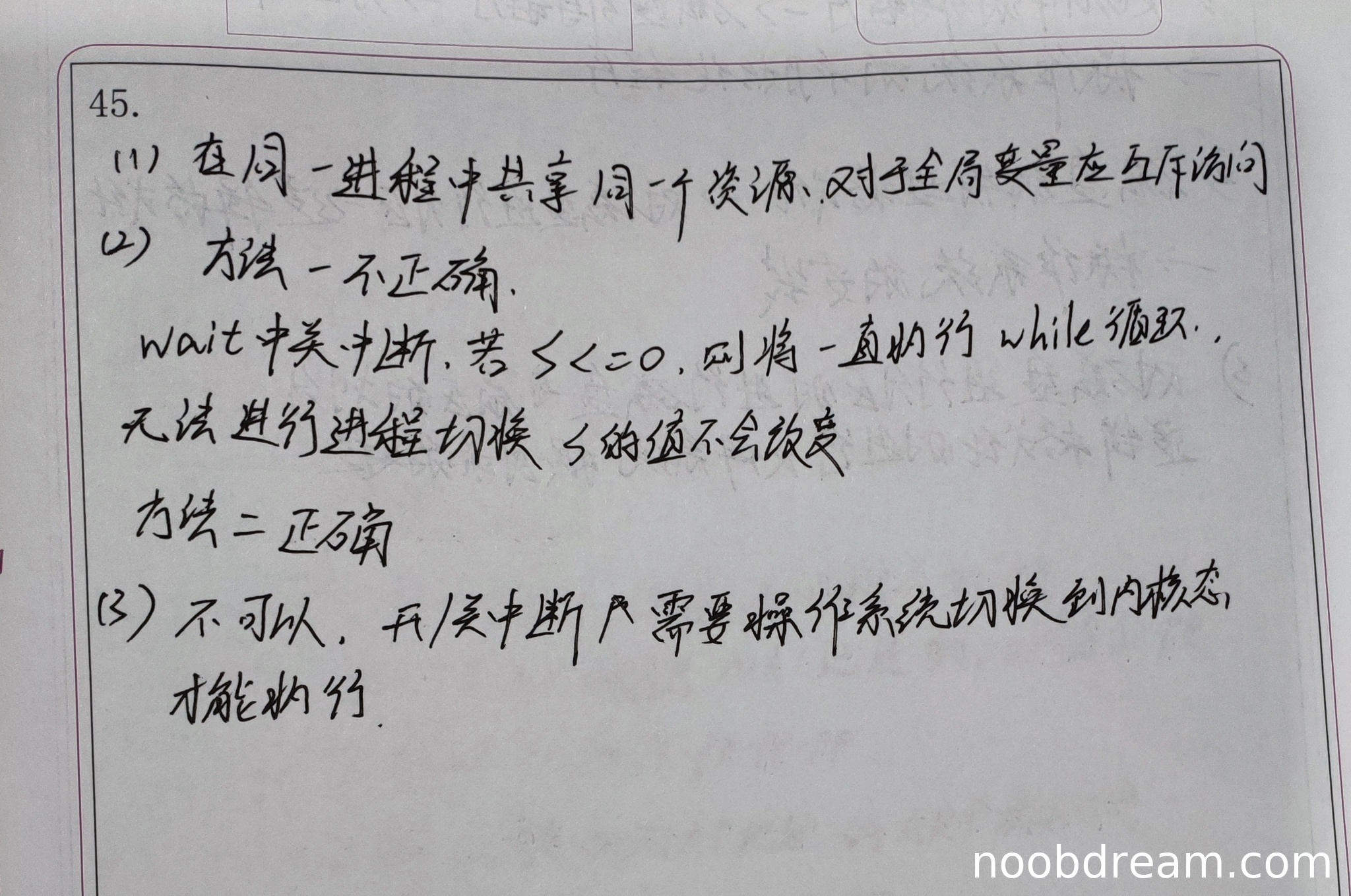 学生回答"在同一进程中共享同一个资源,对于全局变量应互斥访问"得1分。理由:学生正确指出了需要互斥访问全局变量,但没有明确说明信号量S是被多个进程共享的关键点,回答不够完整准确。