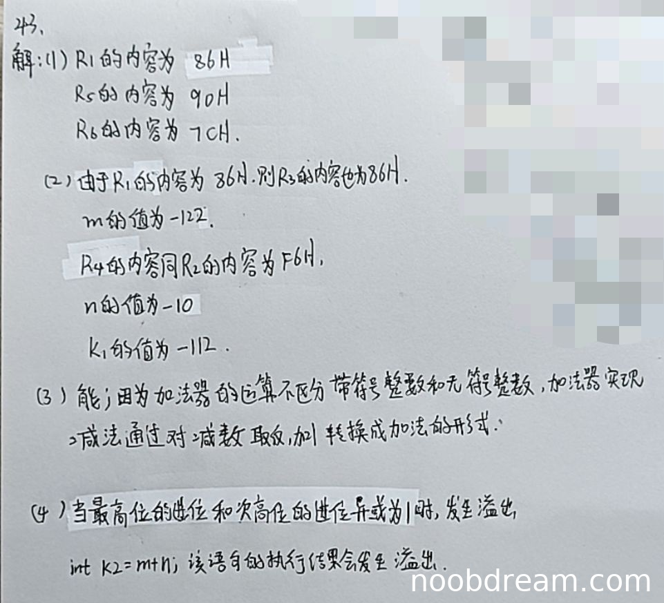 学生答案中R1=86H、R5=90H、R6=7CH与标准答案完全一致。计算过程正确:134=86H,x-y=90H,x+y=7CH(溢出)。得3分。