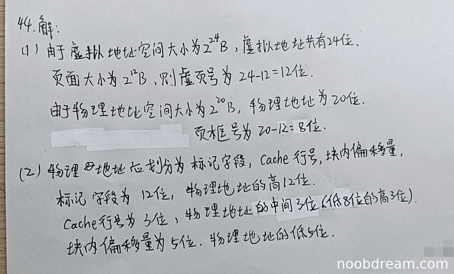 学生答案正确。虚拟地址空间16MB=2^24,故虚拟地址24位;页面大小4KB=2^12,故虚页号为高12位;物理地址空间1MB=2^20,故物理地址20位;页框号为高8位(20-12=8)。答案与标准答案一致,得4分。
