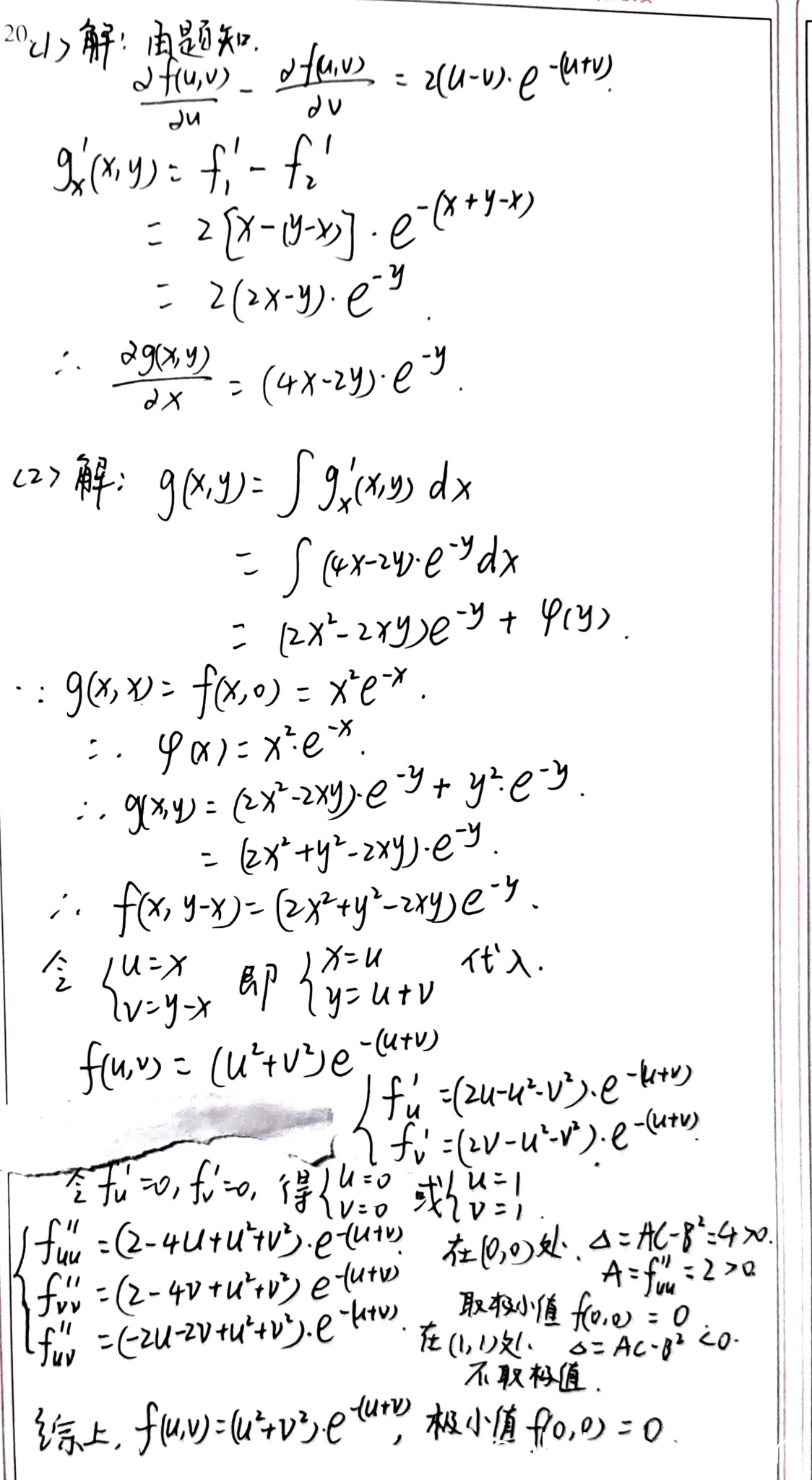 学生通过积分得到 \(g(x,y) = (2x^2 - 2xy)e^{-y} + \varphi(y)\),并利用条件 \(g(x,x) = f(x,0) = x^2 e^{-x}\) 正确求出 \(\varphi(y) = y^2 e^{-y}\),从而得到 \(f(u,v) = (u^2+v^2)e^{-(u+v)}\)。在极值分析中,正确求出一阶偏导数并解得驻点 \((0,0)\) 和 \((1,1)\),计算二阶偏导数及判别式,结论正确。但在二阶偏导数表达式中有轻微误写(如 \(f_{uu}''\) 的表达式与标准答案形式略有差异但不影响结果),根据误写不扣分原则,不扣分。因此得6分。