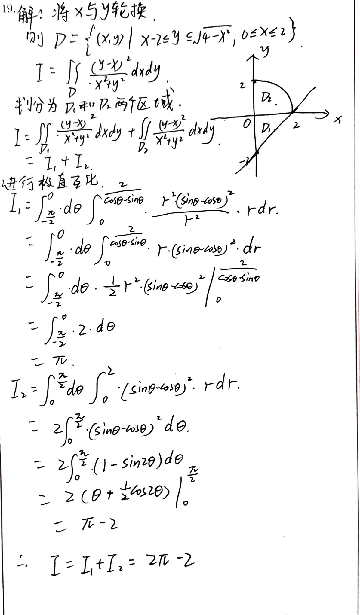 学生计算I₂时: - 积分区域划分与标准答案不同但等价 - 计算过程正确 - 最终结果π-2正确 思路正确,计算准确,不扣分。得4分。