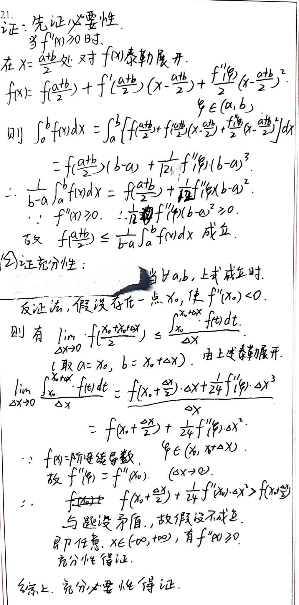 学生使用了泰勒展开的方法,思路正确。在展开后积分时,正确计算了常数项和一次项的积分(一次项积分为0),但在处理二阶余项时,将积分写为 \(\frac{1}{12}f''(\xi)(b-a)^3\),这里存在两个问题:第一,泰勒展开中的 \(\xi\) 依赖于 \(x\),不能直接提到积分号外;第二,即使允许提到积分号外,也应使用积分中值定理得到某个 \(\xi \in (a,b)\),但学生没有明确说明。不过,由于学生正确写出了积分结果并利用了 \(f''(x) \geq 0\) 得到不等式,核心逻辑正确,只是表达不够严谨。因此扣1分。
