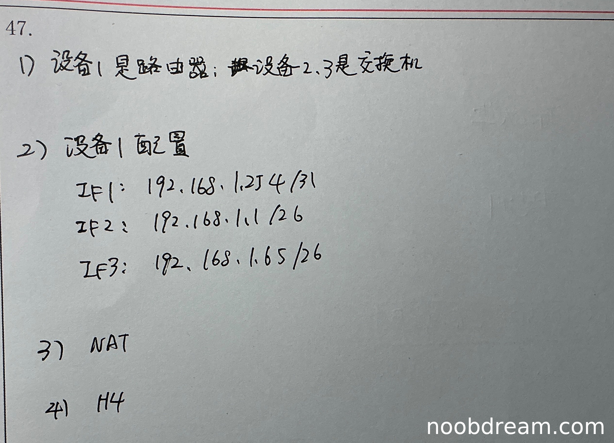 学生回答:设备1配置IF1:192.168.1.254/31,IF2:192.168.1.1/26,IF3:192.168.1.65/26。标准答案为设备1的接口需要配置IP地址,且IF1、IF2、IF3的IP地址分别为192.168.1.254、192.168.1.1、192.168.1.65。学生答案中IF1的子网掩码/31有误(应为/26或更常规的掩码),但题目主要考察IP地址配置,且识别中可能存在误写(如/31可能为/26的识别错误)。根据禁止扣分规则,对于识别错误导致的逻辑错误不扣分。因此,核心IP地址正确,得4分。